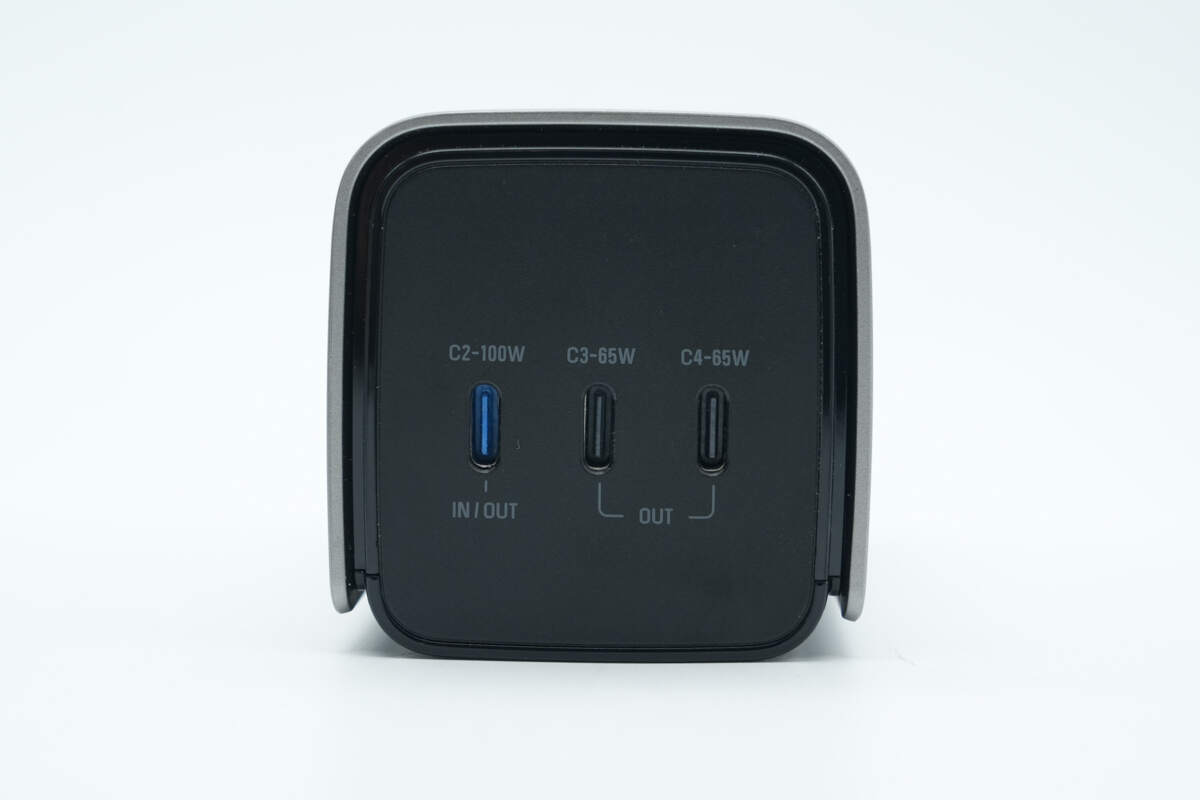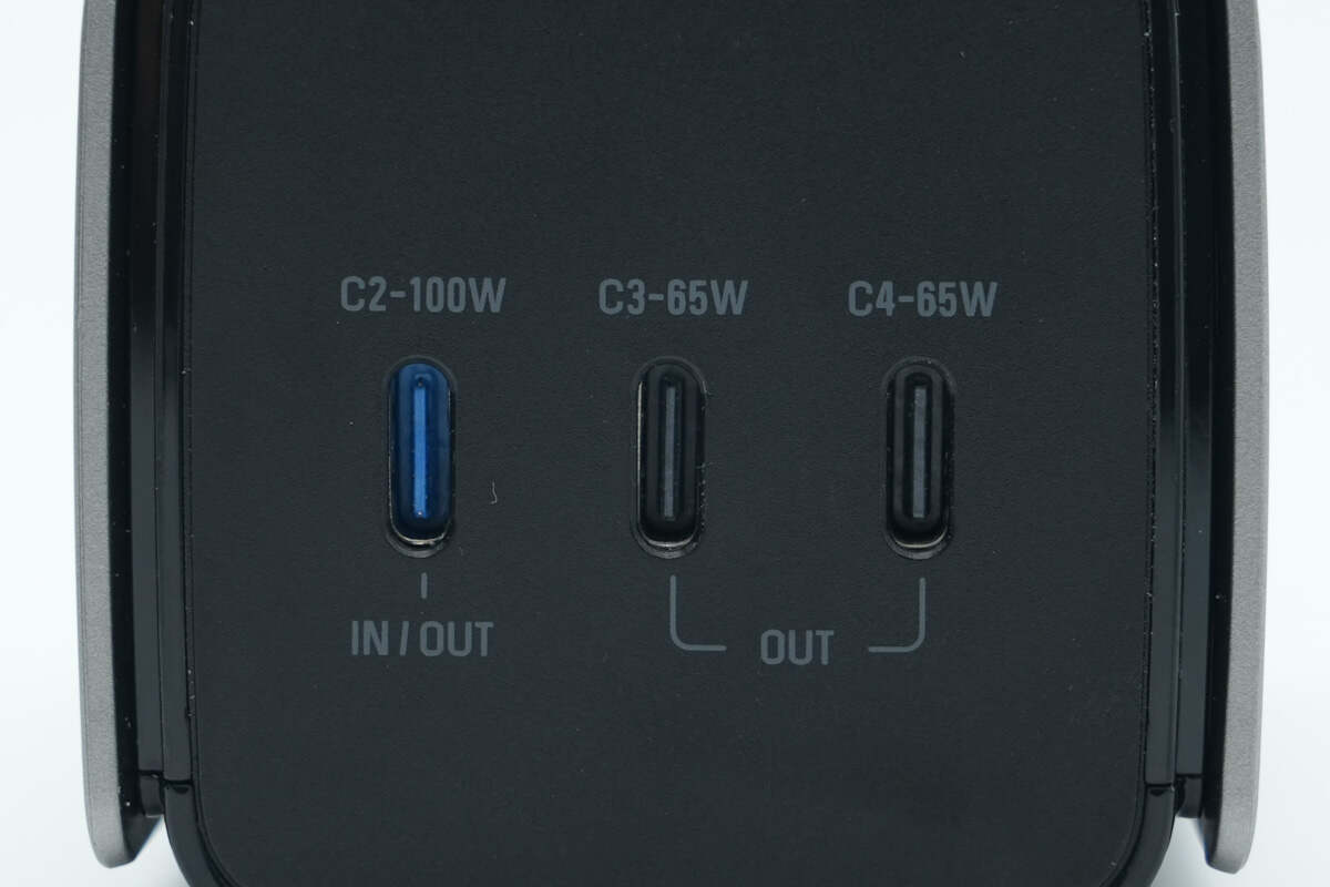 On both sides of the ports are printed labels for IN, OUT, port numbers, and specifications. The USB-C2 port, which supports bidirectional fast charging, is distinguished by a blue plastic sheet.