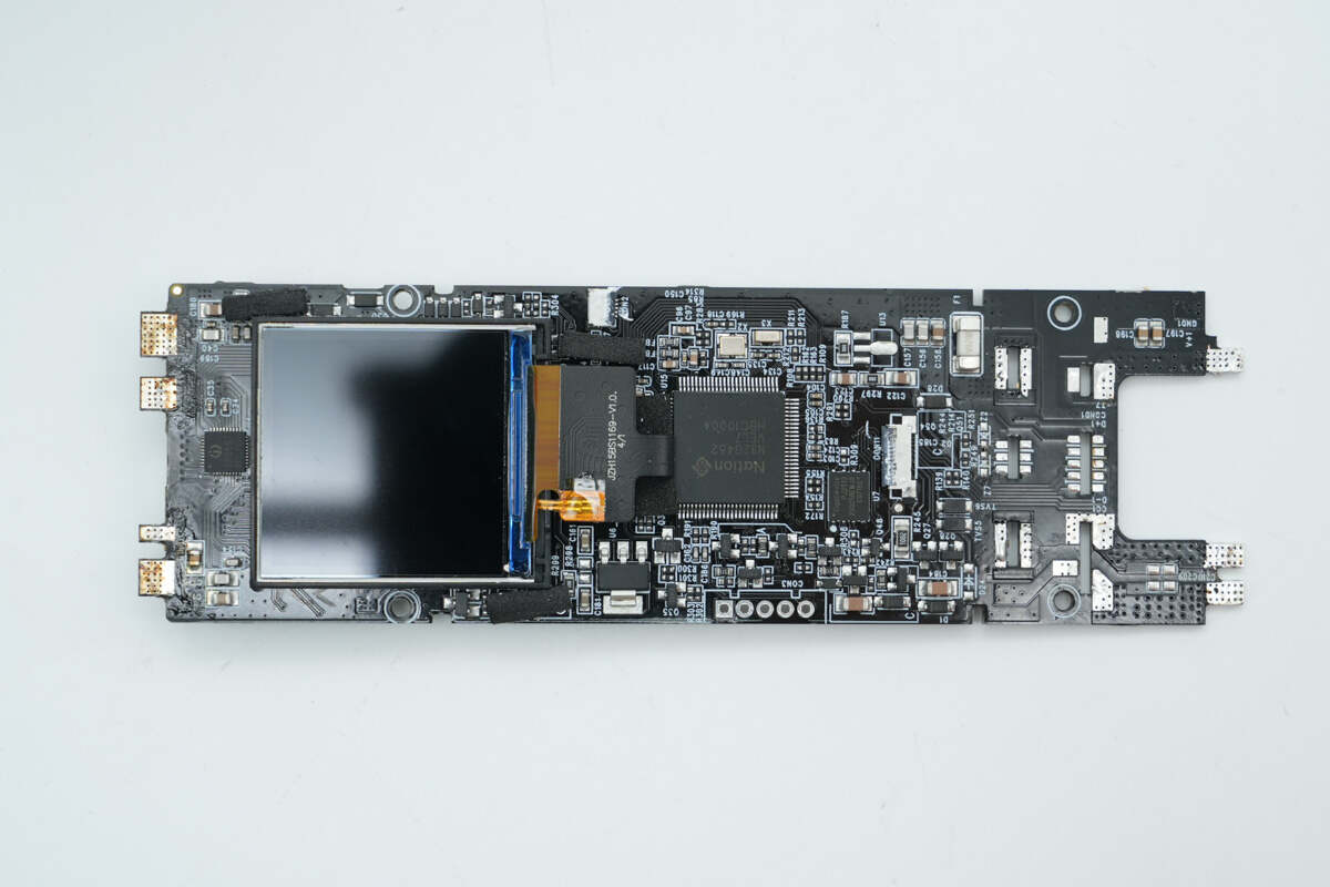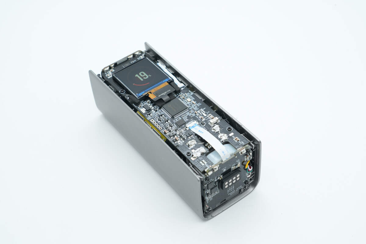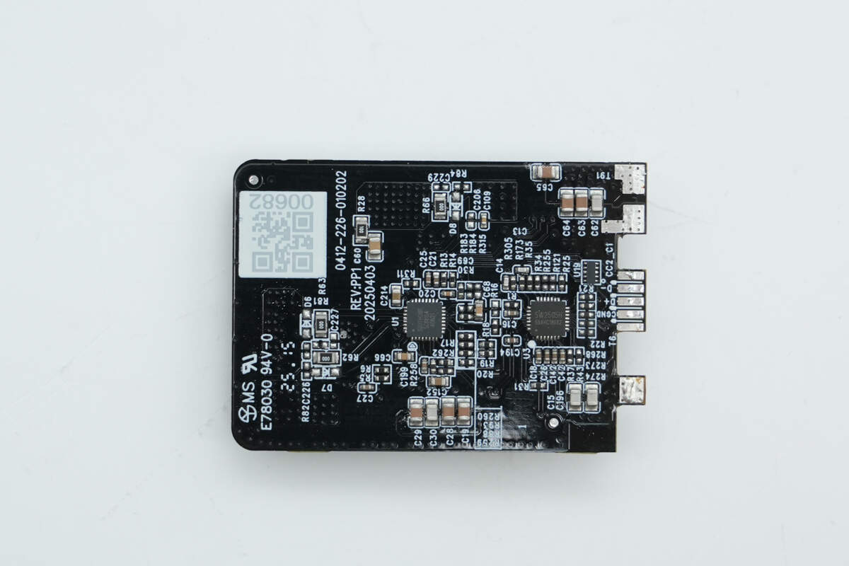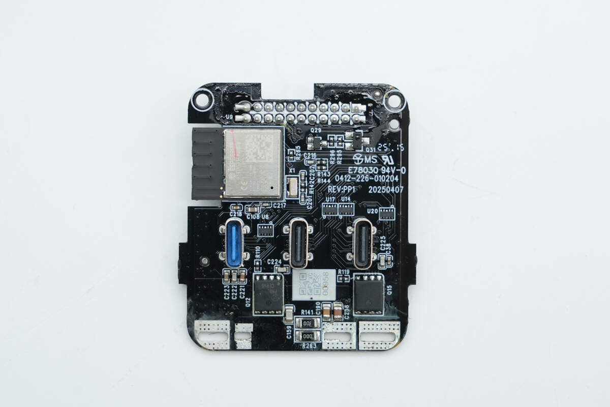 Separate the two PCBs. The top PCB features an MCU, memory, LDO voltage regulator, and a buck-boost SOC for the USB-C3 and USB-C4 ports. The display is connected to the PCB via a ribbon cable.