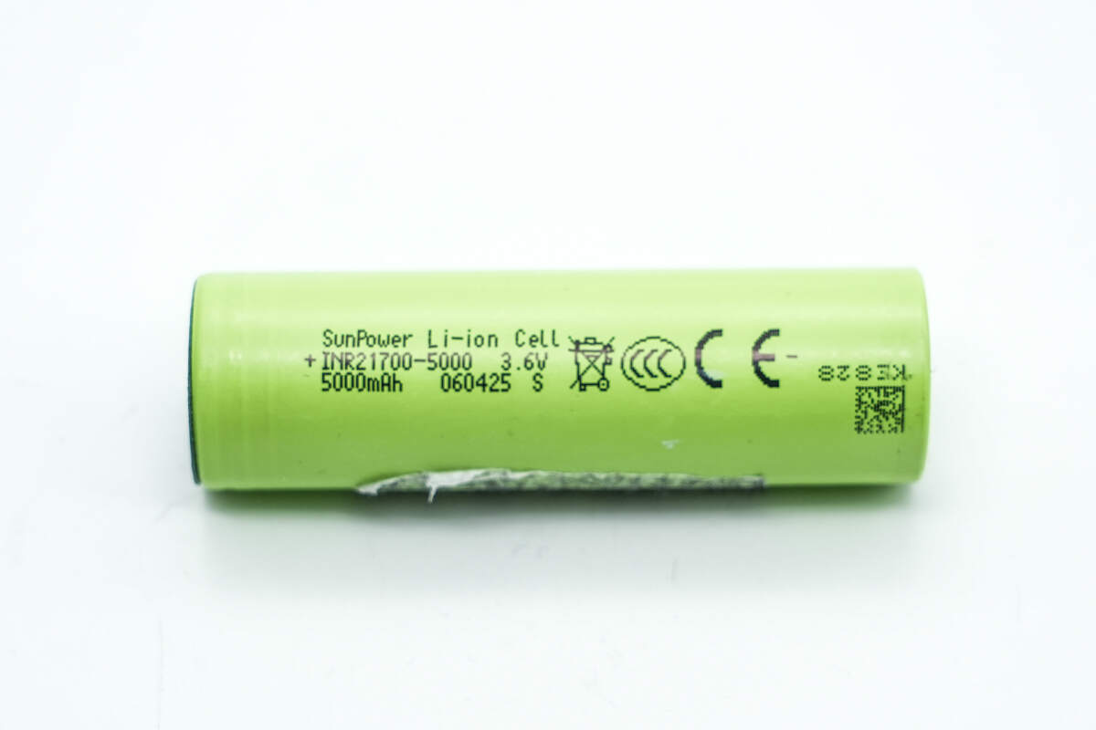 The cells are from SunPower, model INR21700-5000. They have a nominal voltage of 3.6V, a nominal capacity of 5000mAh, and a charge cut-off voltage of 4.2V. The cells are CCC and CE certified.