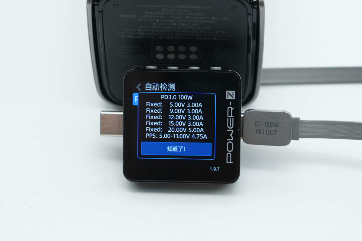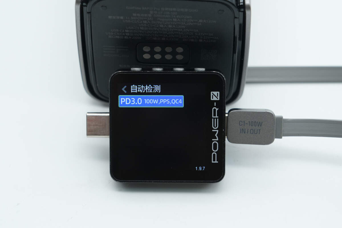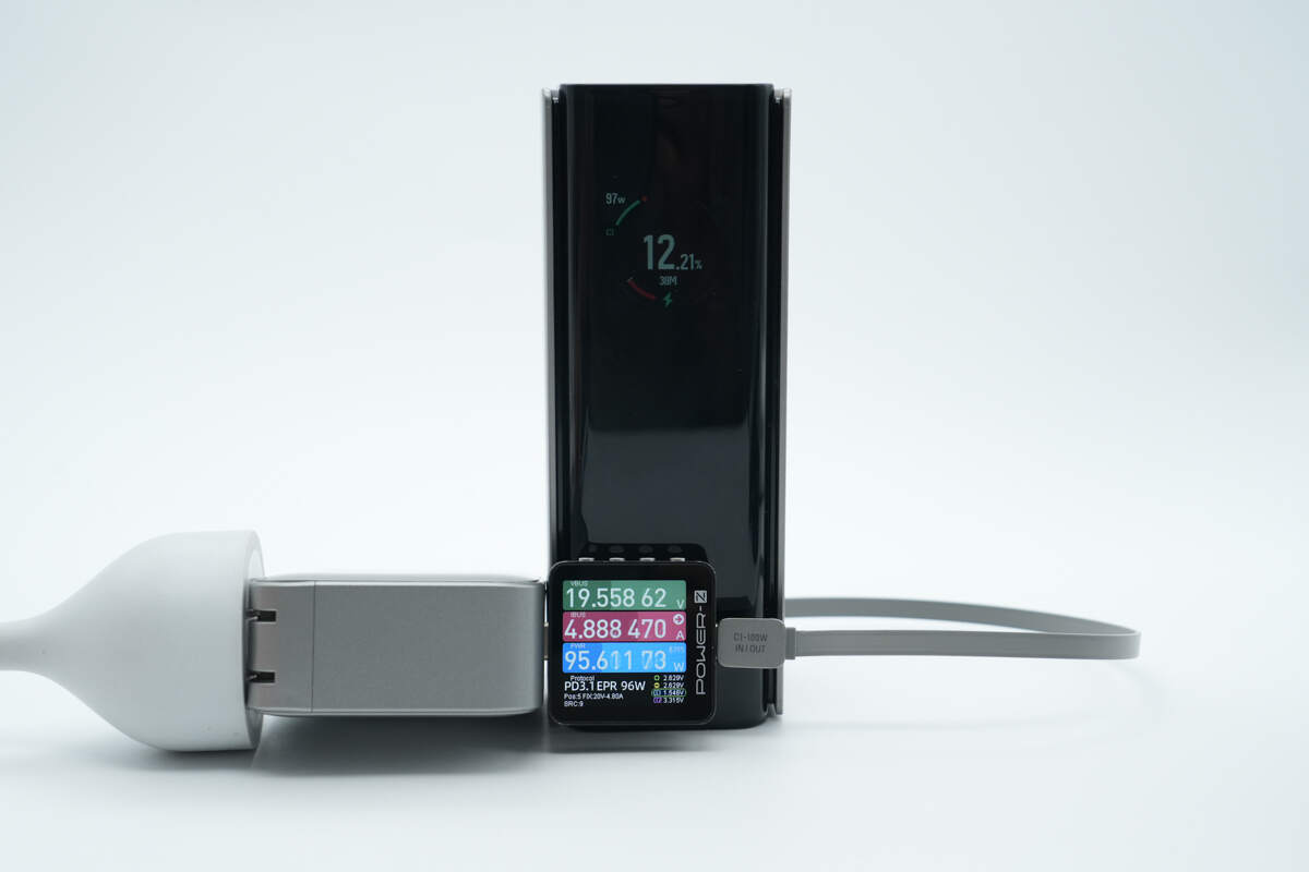 Using the EcoFlow RAPID Pro 140W GaN charger to charge the power bank via the built-in USB-C1 cable, the charging power reaches about 95.61W, successfully activating 20V 5A (100W) PD fast charging.