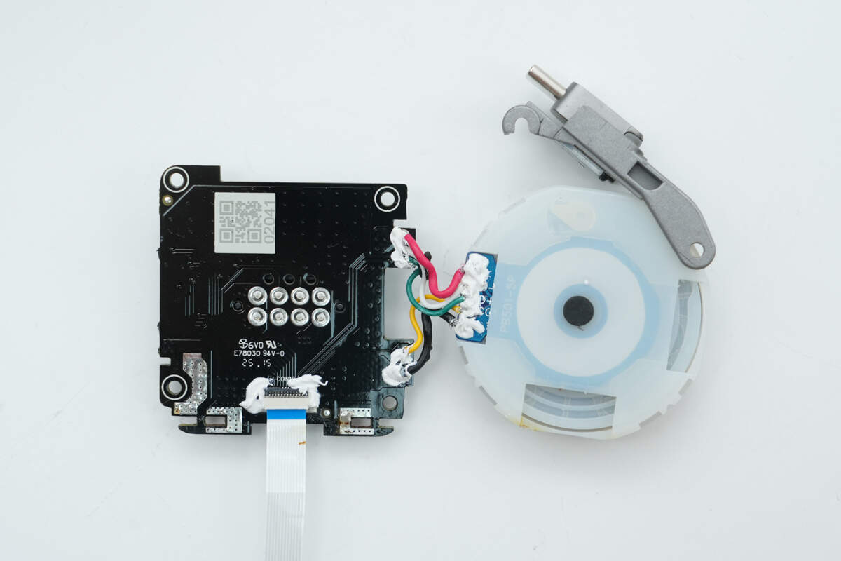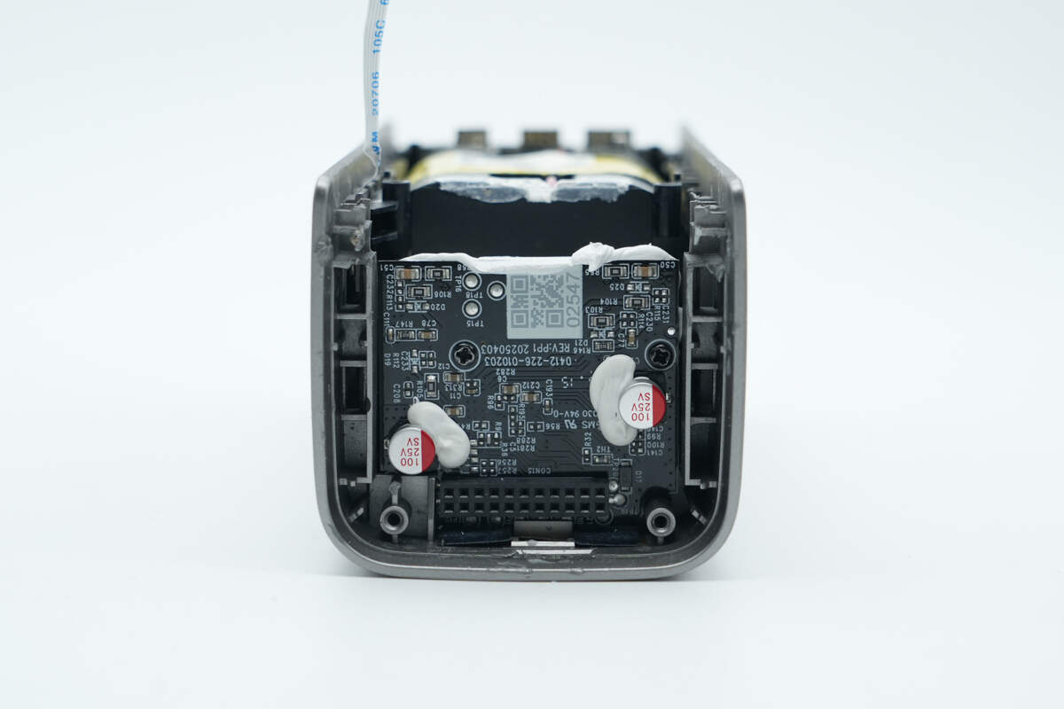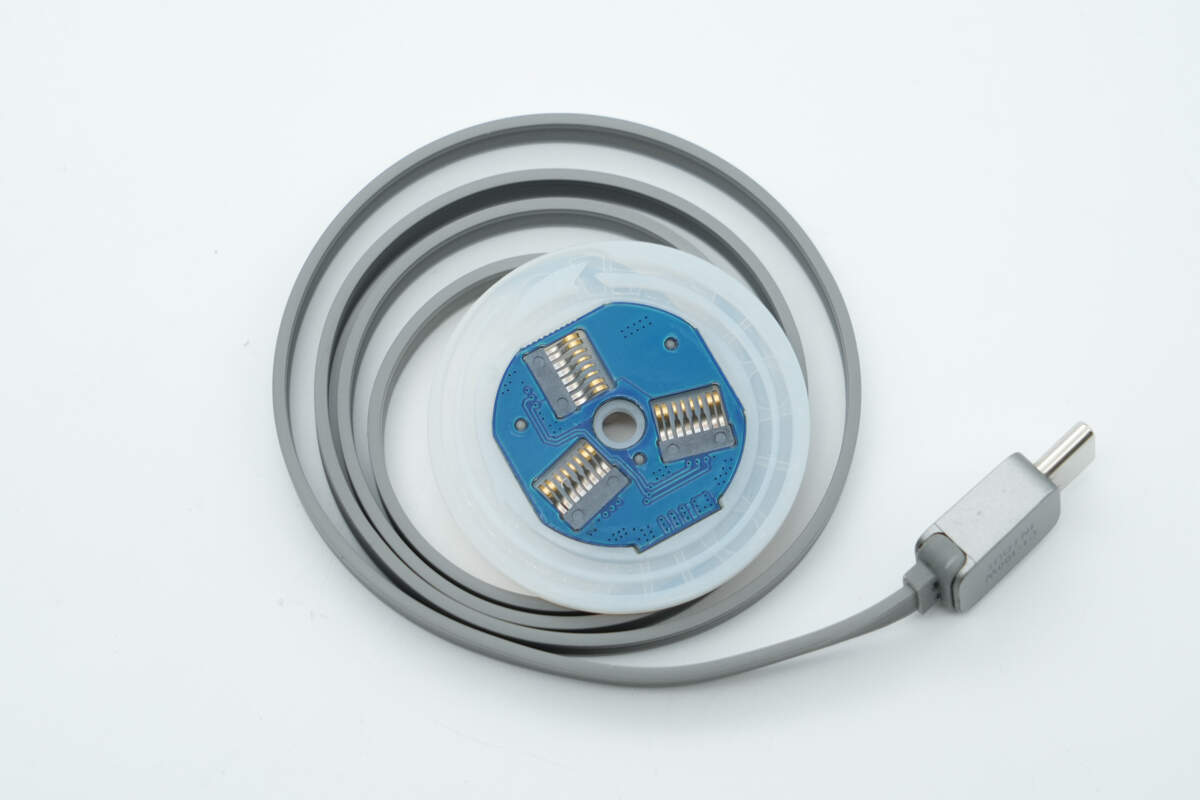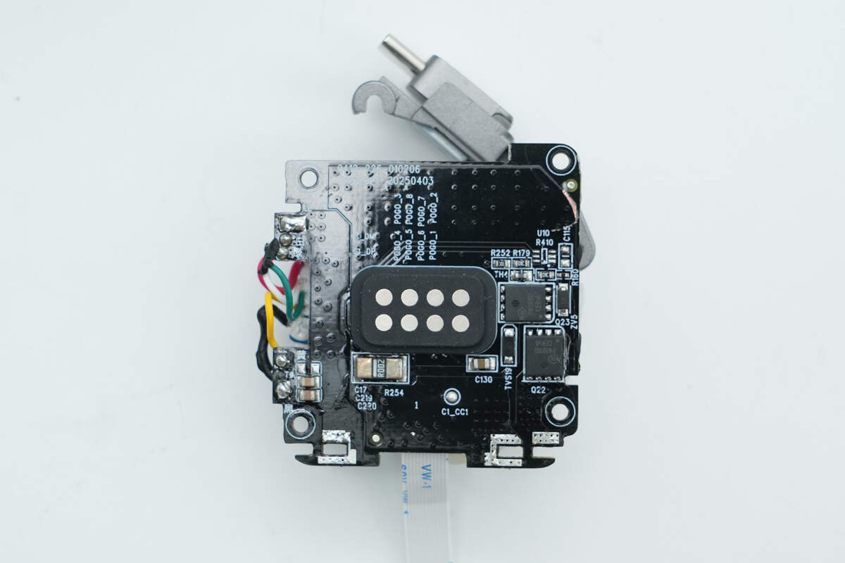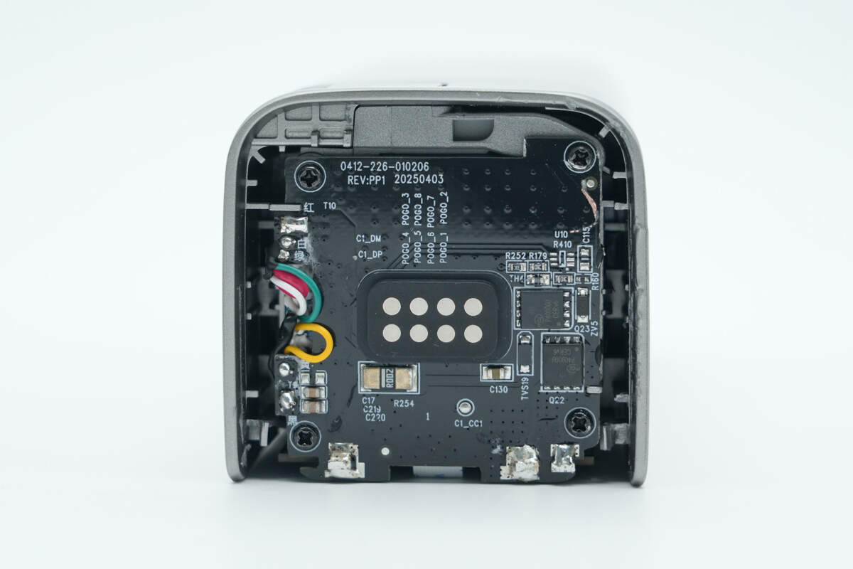 The PCB with the PogoPin input contacts is secured with screws. The core wires of the built-in USB-C cable are soldered to this PCB.