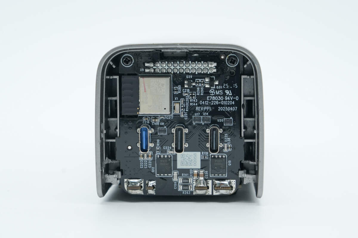The PCB housing the three USB-C sockets on the other end is also secured with screws.