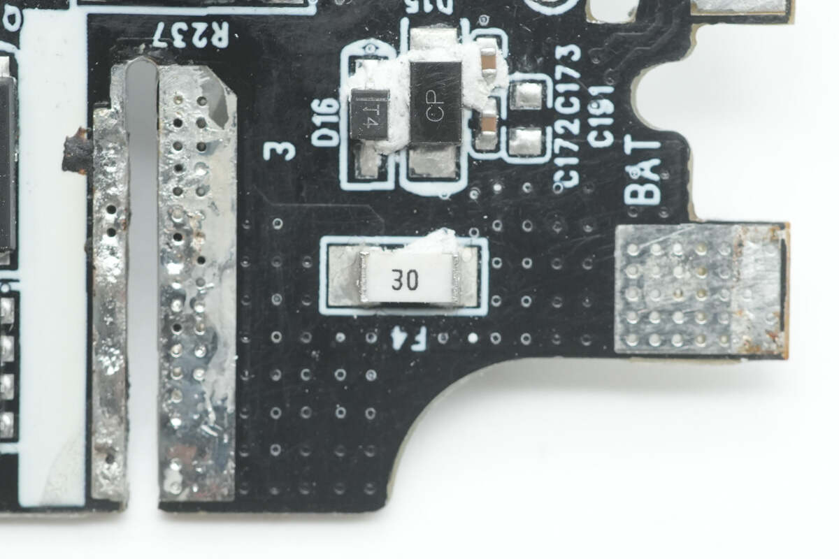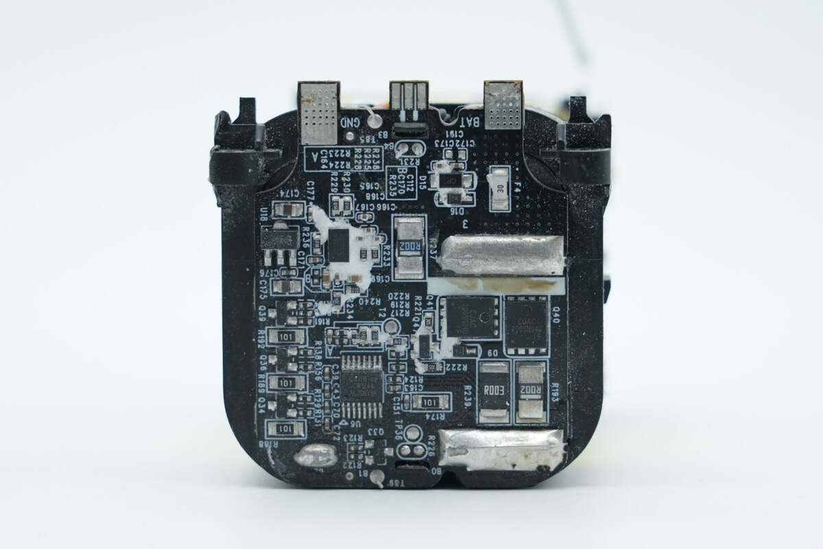 The USB-C port PCB is soldered to the top PCB. The backside of both PCBs also has a ribbon cable connection, and the sockets are extensively filled with white adhesive for reinforcement.