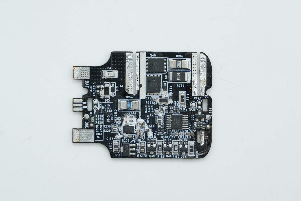 The lithium battery protection PCB connected to the battery pack features an SMD fuse, battery protection chip, battery protection MOSFETs, battery fuel gauge, and balancing circuit on the front.