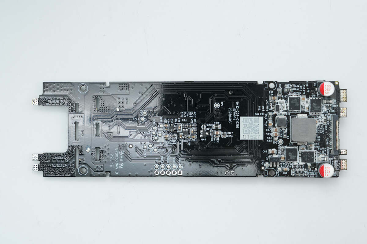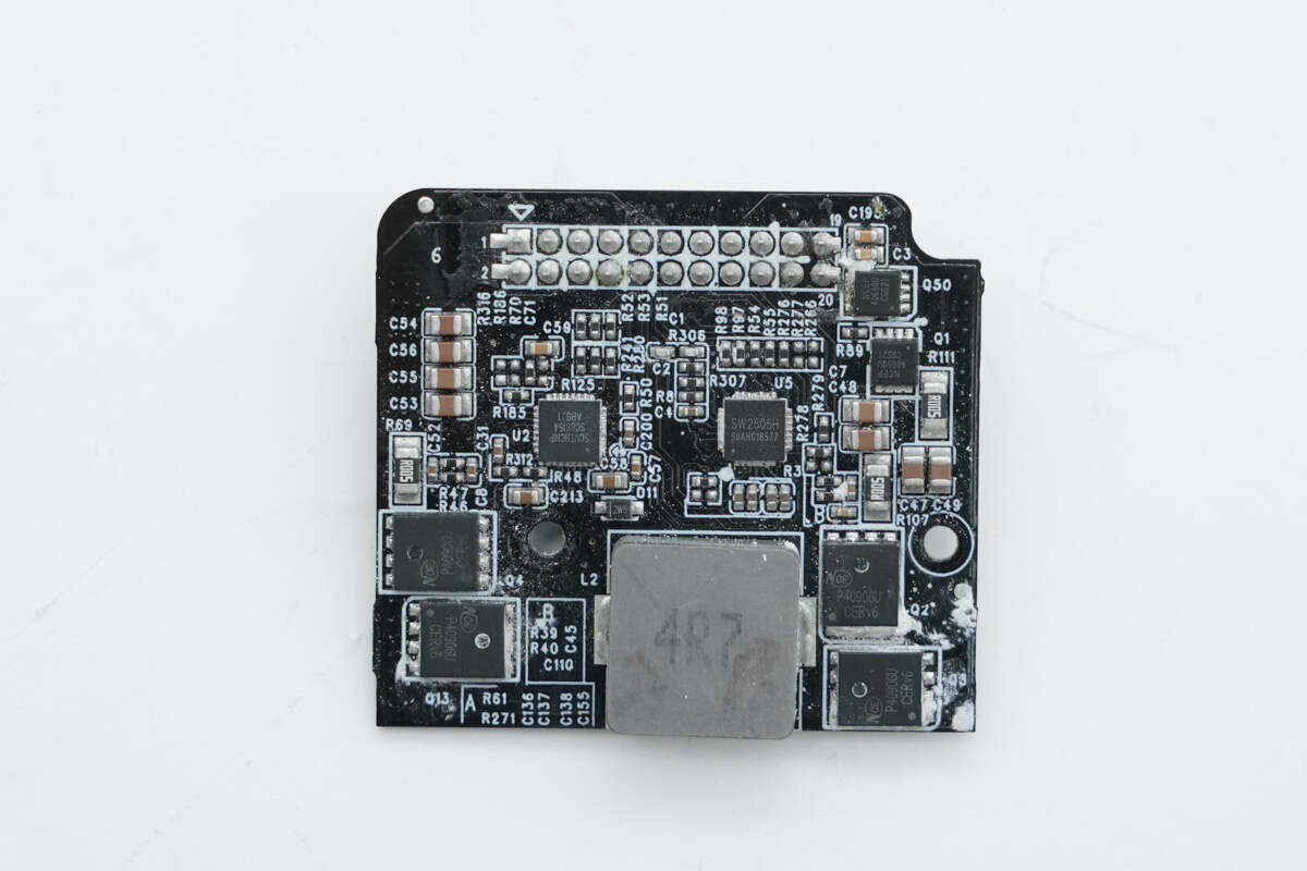 Remove the white adhesive from the back. The backside features buck-boost MOSFETs for the USB-C3 and USB-C4 interfaces, along with buck-boost inductors and output solid capacitors. Additionally, there is a synchronous buck converter and a buck inductor that supply power to the MCU and display.