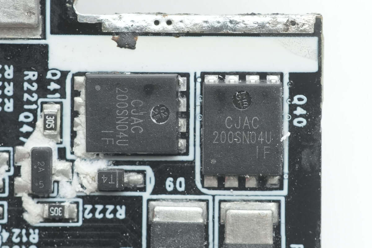 The battery protection MOSFETs are from JSCJ, model CJCA200SN04U. They are NMOS type with a voltage rating of 40V, a conduction resistance of 0.67mΩ, and are packaged in a PDFNWB 5*6-8L form factor.