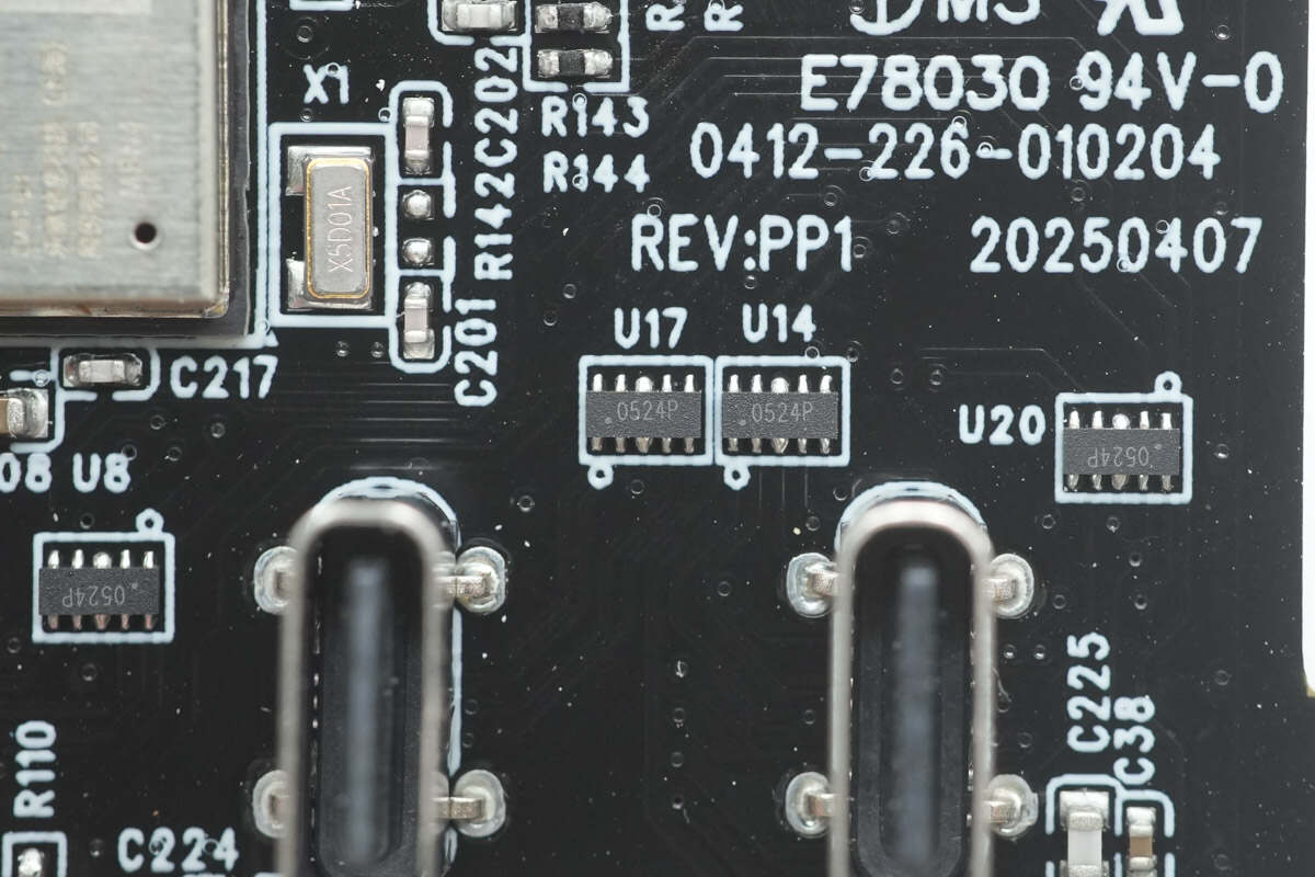 At the port end, there is a second PCB connected to the PCB with the USB-C sockets via pin headers.