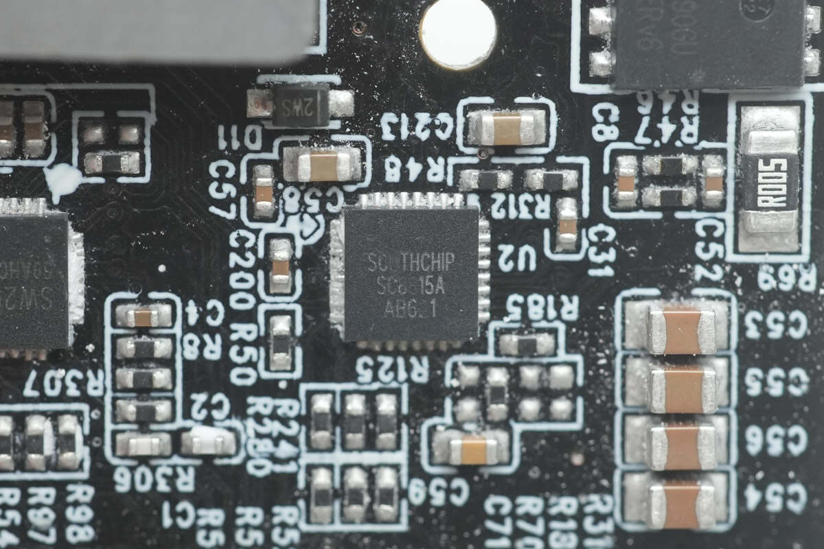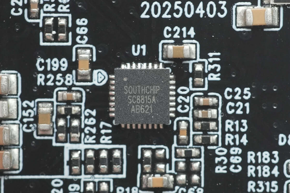 The synchronous buck-boost controller for the USB-C2 port is from SouthChip, model SC8815A. It is an efficient bidirectional synchronous buck-boost controller that supports 1-6 cell battery charging. The chip features an I2C interface and offers complete lithium battery charging management, with control over battery charging current and voltage, reverse discharge output voltage, and input/output current limits via the I2C bus.