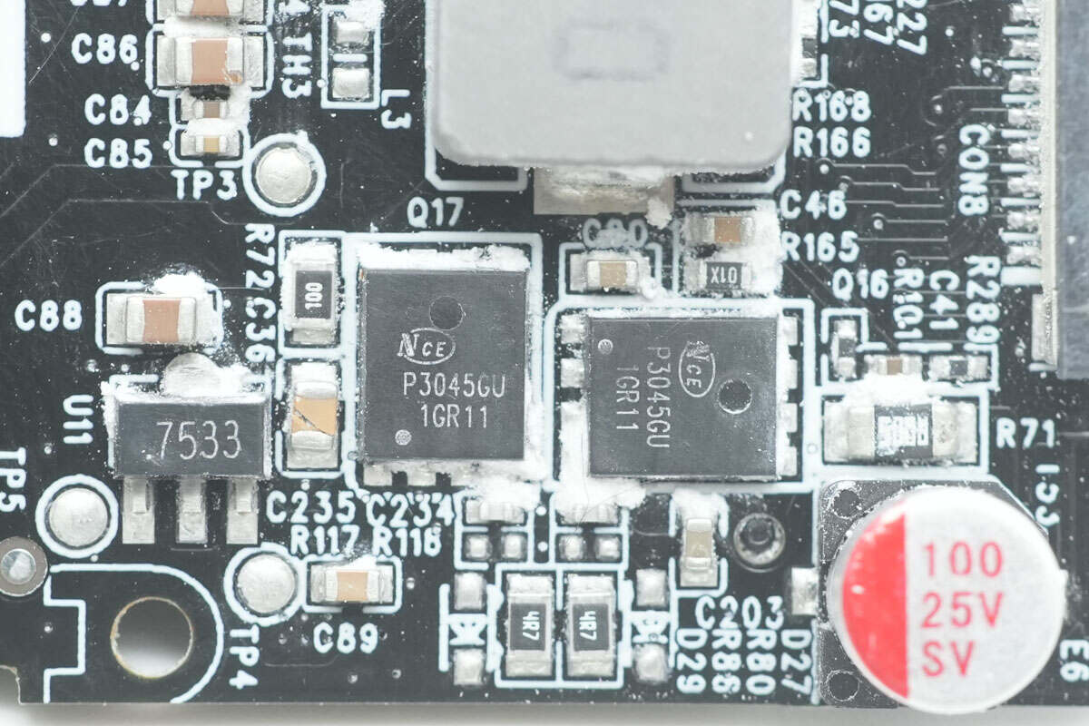 Close-up of the two additional NCEPower NCEP3045GU synchronous buck-boost MOSFETs.