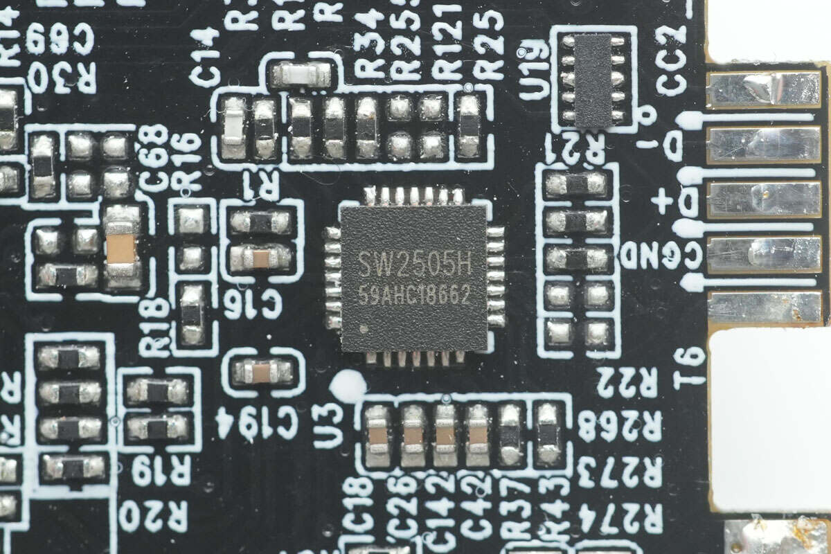The protocol chip used is the iSmartWare SW2505H. This is a low-power controller chip that integrates full protocol support, including PD3.1, QC, and UFCS. It is certified with both USB PD3.1 EPR and UFCS standards and supports DRP mode. The chip features an embedded MCU, 16 GPIOs, and C-type support for online upgrades, as well as simulation debugging. It also supports optocoupler/FB control and I2C master-slave mode.