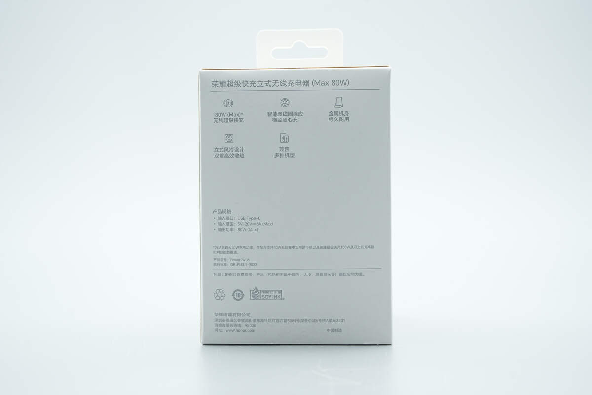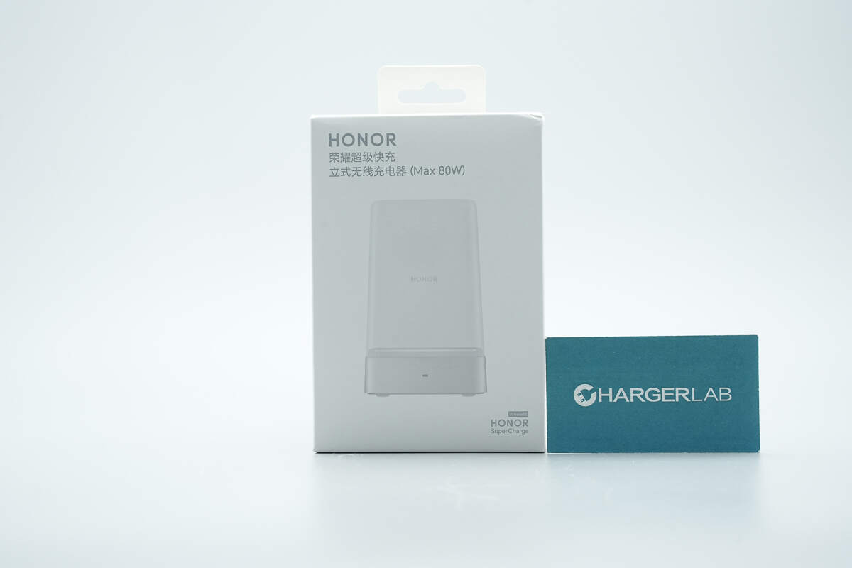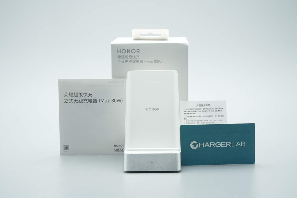 The package includes the HONOR 80W Wireless Charger Stand, a user manual, and a warranty card.