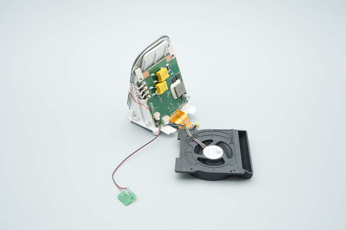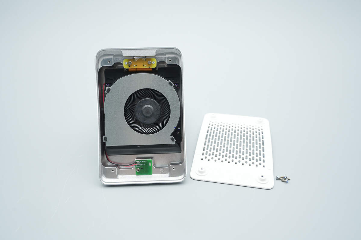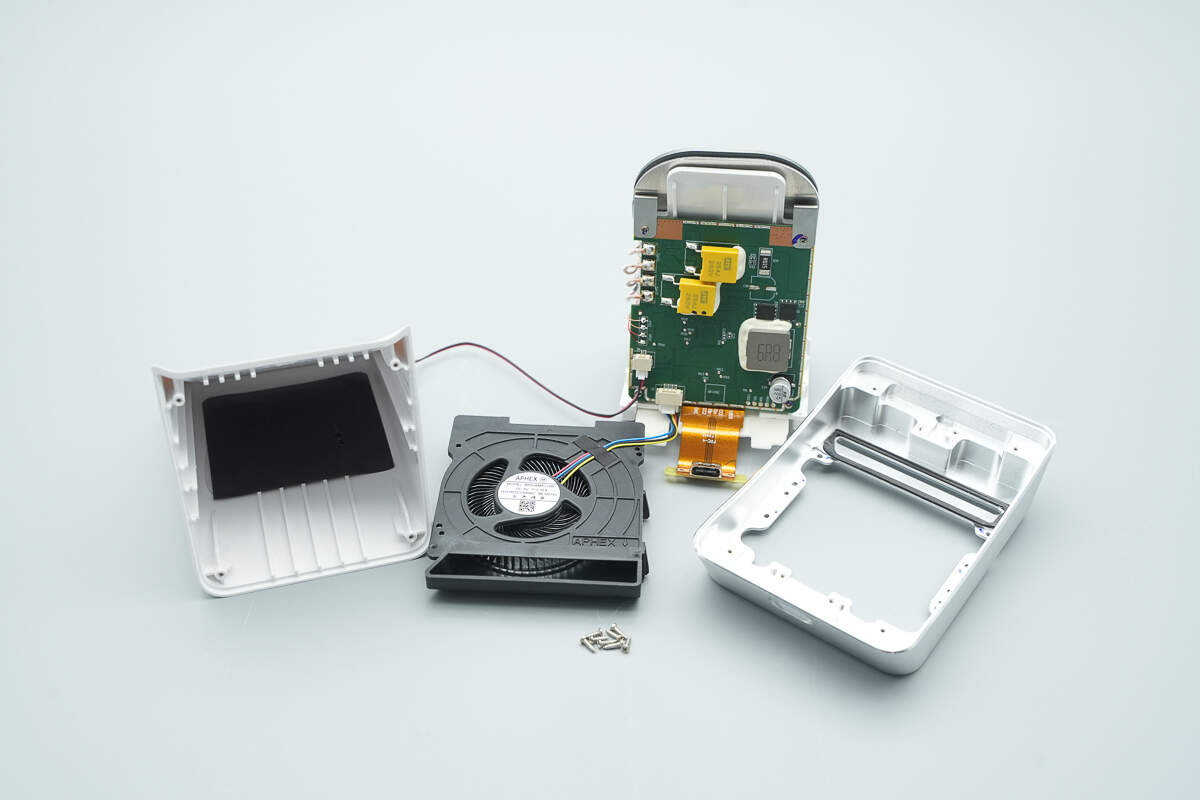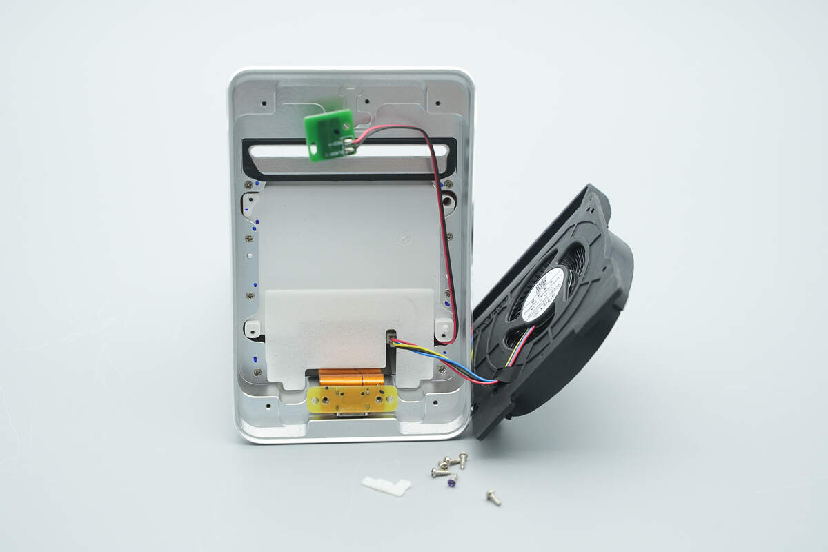 The fan is secured with screws. The USB-C port and LED indicator each have independent PCBs, which are also fixed in place with screws.