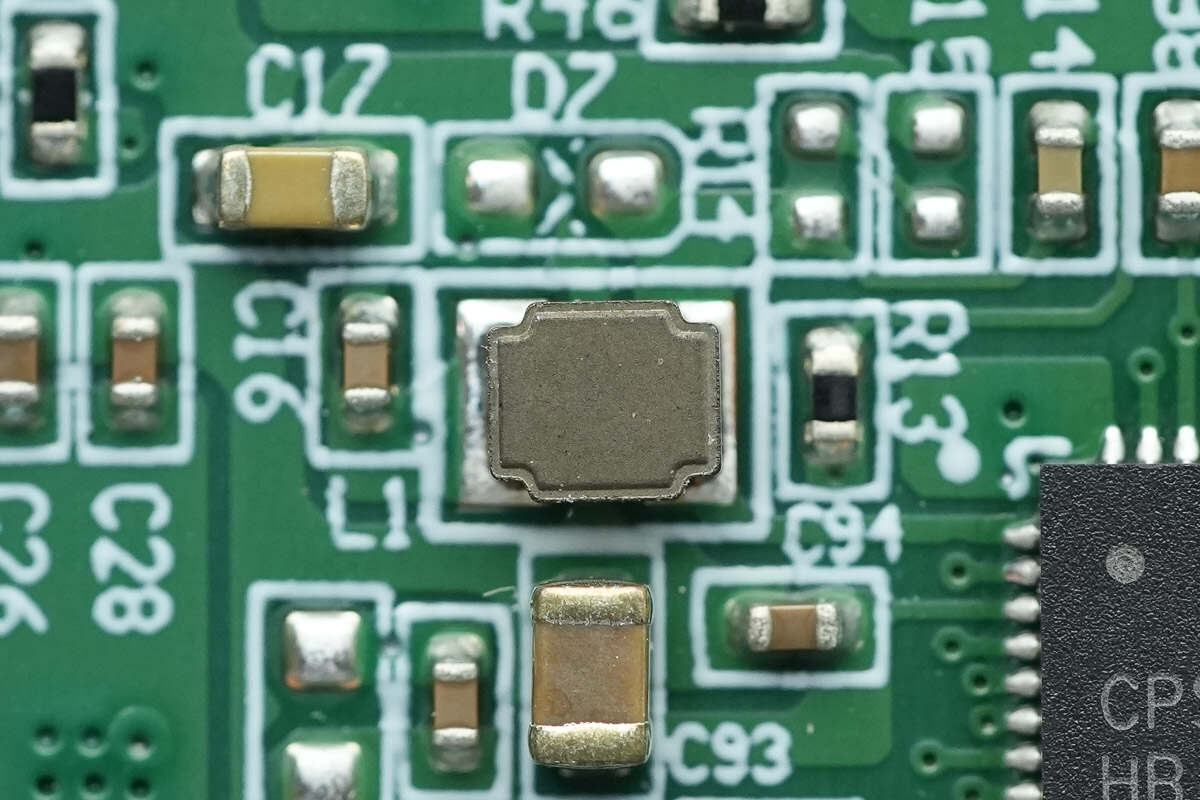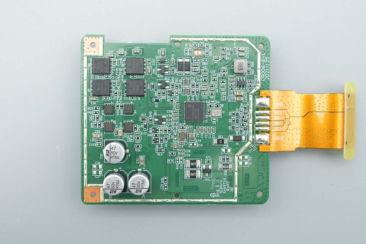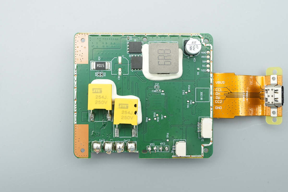The PCB of the USB-C socket is connected to the main PCB via a ribbon cable. The front houses the wireless charging controller chip, wireless charging power MOSFETs, coil-switching MOSFETs, a synchronous buck converter, solid capacitors, and other components.