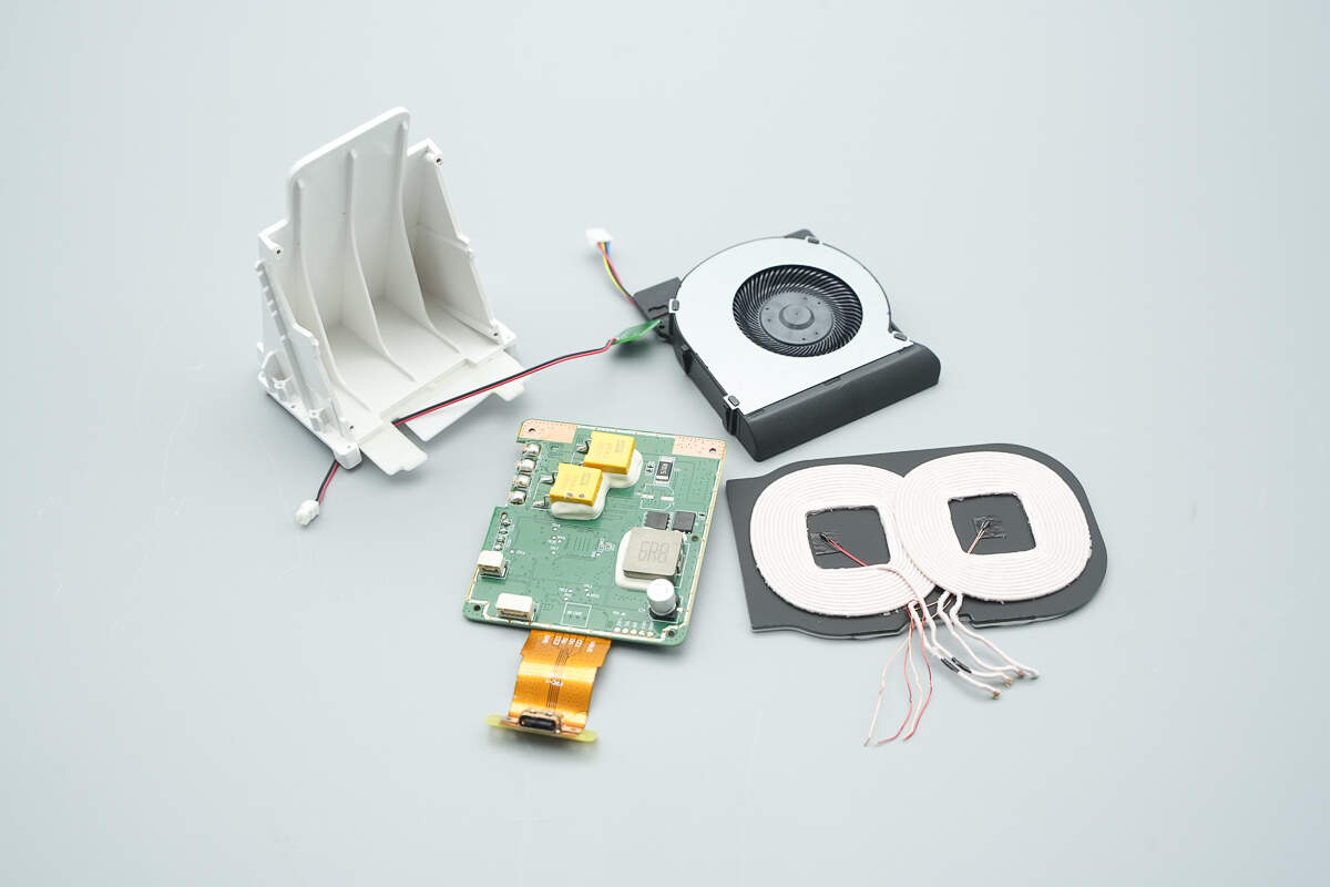The PCB and wireless charging coils are secured using a plastic bracket. The fan and LED indicator PCBs are connected via wires and feature a plug-and-play design.