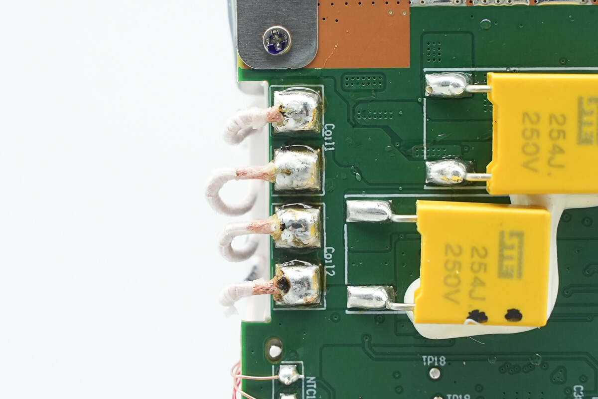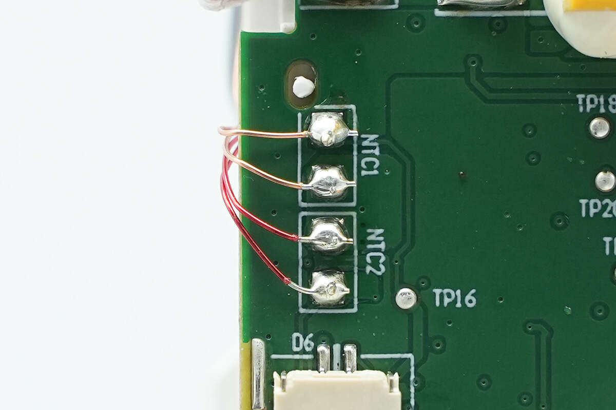 Two thermistors monitor the temperature of the dual coils, with well-formed solder joints.