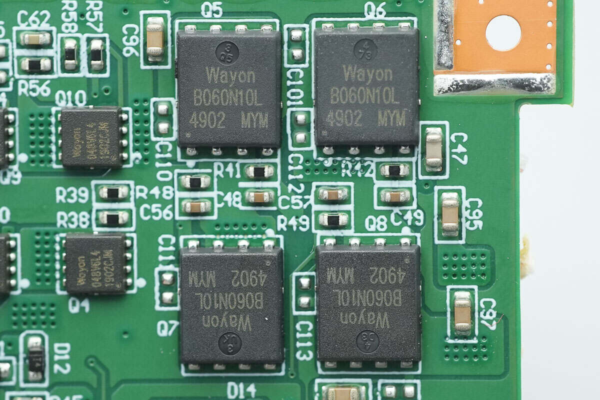 The MOSFETs used for switching the wireless charging coils are also from WAYON, model WMB060N10LG2. They are NMOS devices with a voltage rating of 100 V and an on-resistance of 6 mΩ, packaged in PDFN 5060‑8L.