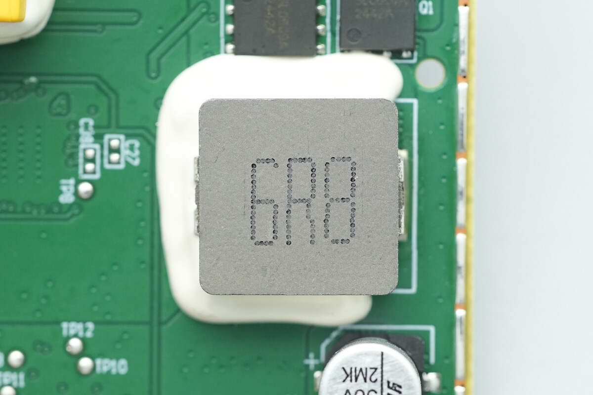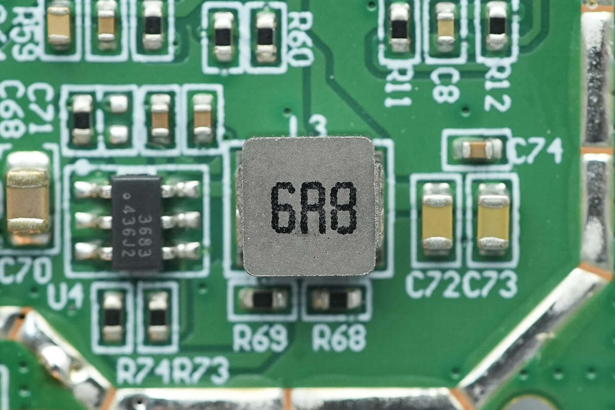 The 6.8 μH boost inductor is secured and protected with adhesive reinforcement.