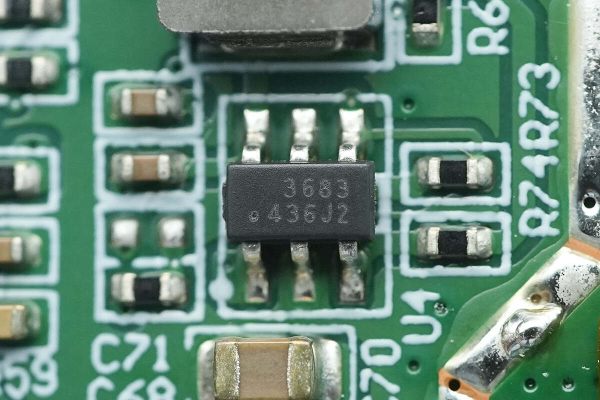 The synchronous buck converter used to step down the voltage for the fan is marked with 3683 and comes in an SOT23-6 package.