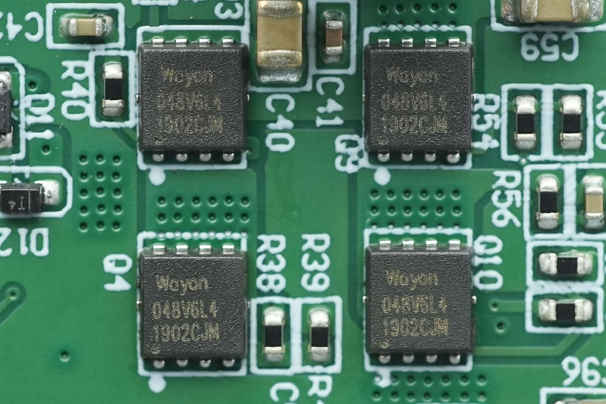 The four wireless charging power MOSFETs are from WAYON, model WMQ048NV6LG4. They are NMOS devices with a voltage rating of 65 V and an on-resistance of 5.2 mΩ, packaged in PDFN 3030‑8L.