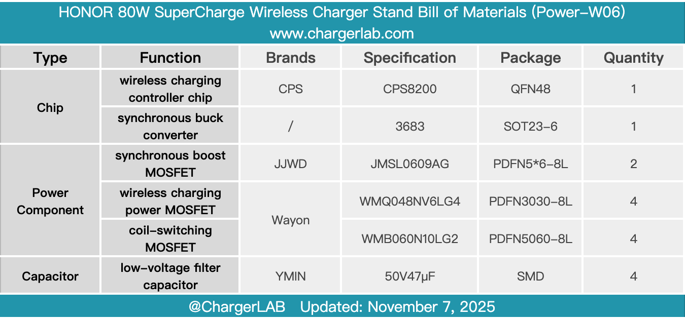 After taking it apart, we found that it is designed based on the CPS CPS8200 wireless charging solution, paired with JJWD MOSFETs for input boost conversion. The wireless charging power MOSFETs and coil-switching MOSFETs come from WAYON, and multiple solid capacitors from YMIN are used for filtering.