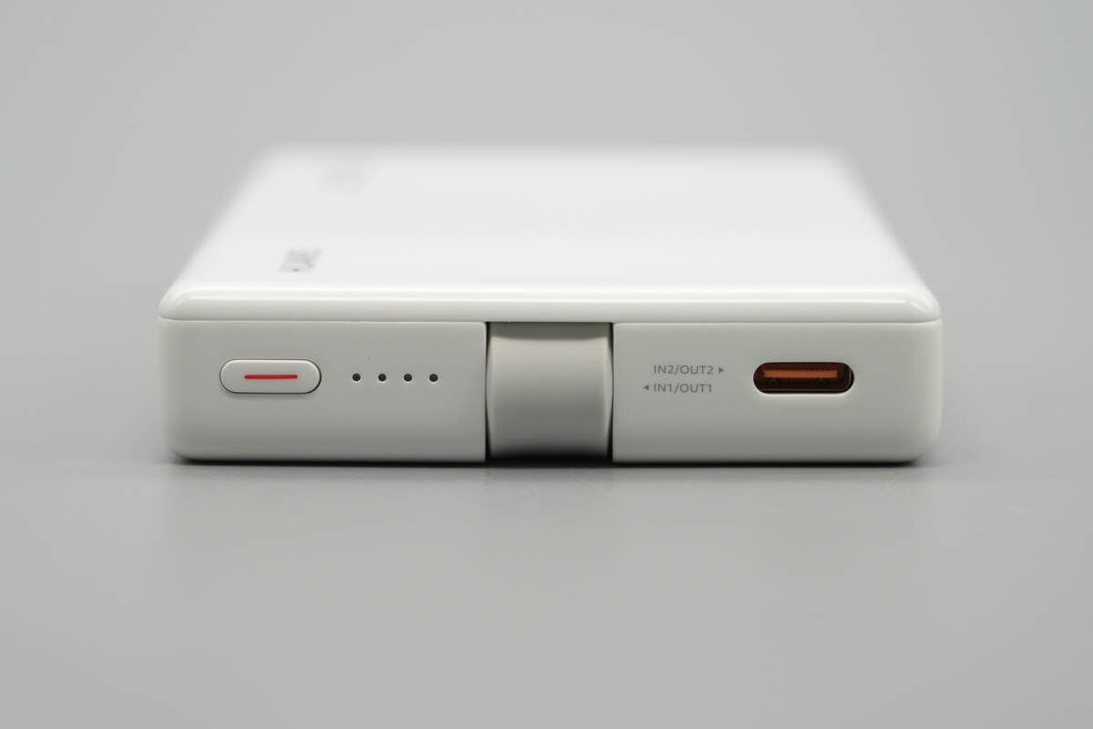 The back features a storage slot for the built-in USB-C cable.
