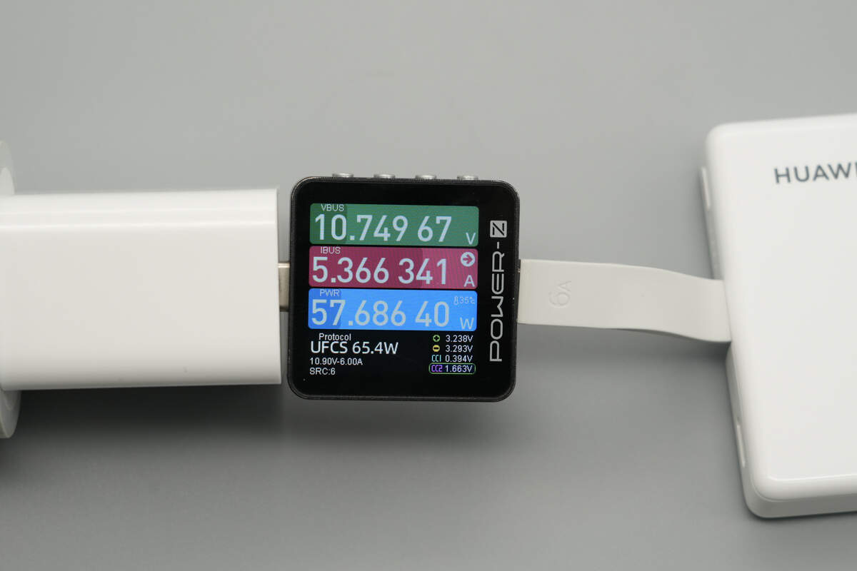 When charging the power bank using a Huawei 100W charger via the built-in USB-C cable, the measured output power of the charger is about 57.69W.