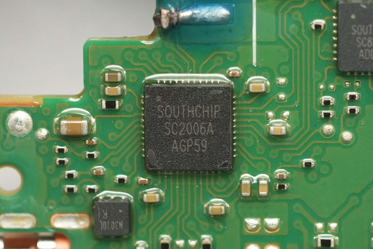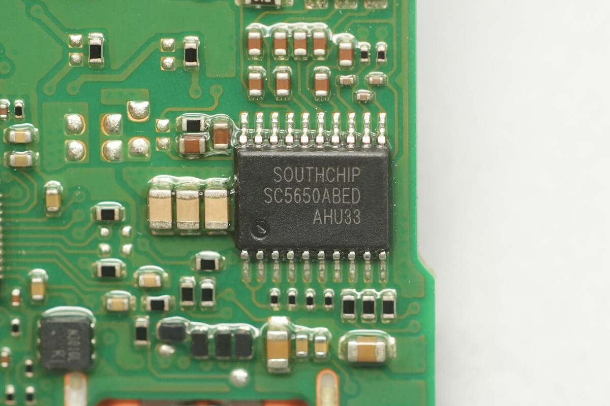 The protocol chip for both the built-in USB-C cable and the USB-C2 port is SouthChip SC2006A, a fast-charging controller that supports three Type-C DRP ports. It is compatible with all major fast-charging protocols and features CC and DPDM interfaces. Its target applications include power banks, car chargers, and power tools.