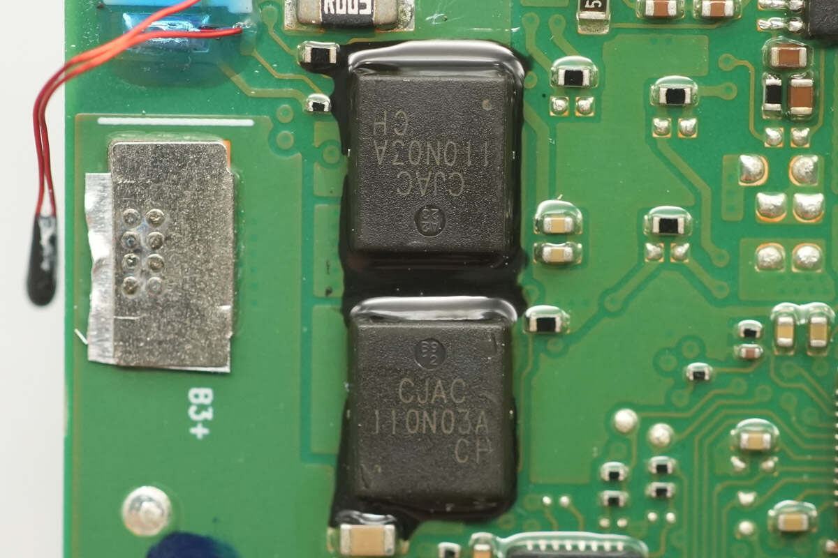 The battery protection MOSFETs are from JSCJ, model CJAC110N03A. They are N-channel MOSFETs with a voltage rating of 30 V and an on-resistance of 1.8 mΩ, packaged in a PDFNK 6 5×6-8L package.
