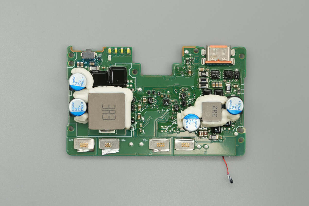 The back side of the PCB is equipped with a battery protection chip, battery protection MOSFETs, a synchronous buck-boost controller, synchronous buck-boost MOSFETs, a protocol chip, VBUS MOSFETs, and a thermistor.