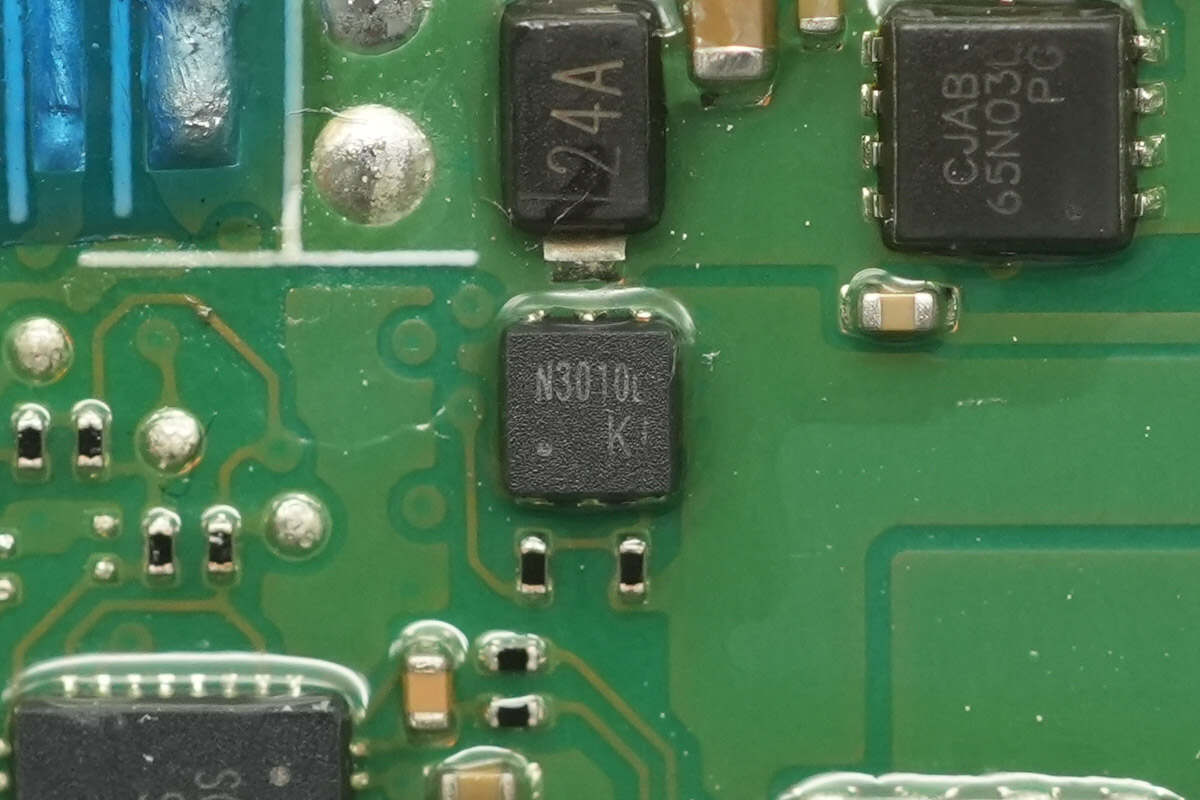 The VBUS MOSFETs for the built-in USB-C cable are from JSCJ, model CJAB65N03L. They are N-channel MOSFETs with a voltage rating of 30 V and an on-resistance of 2.5 mΩ, packaged in PDFNWB 3.3×3.3-8L.