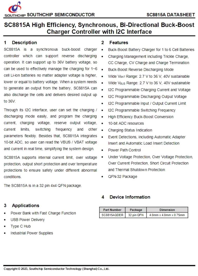 The SC8815A integrates a 10-bit ADC and provides charging status indication. It supports automatic adapter and load insertion detection, undervoltage protection, overvoltage protection, overcurrent protection, short-circuit protection, and overheat shutdown. The chip comes in a QFN32 package and is suitable for PD fast-charging power banks, USB-C hubs, and industrial power applications.