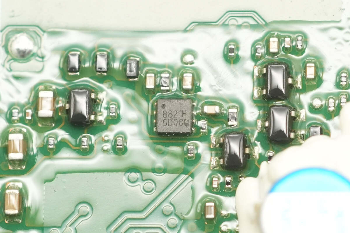 After taking it apart, we found that it uses three ATL cells connected in series. The higher battery voltage allows lower currents on the PCB during high-power output, ensuring efficiency and keeping heat generation under control. The design incorporates a full solution with the SouthChip SC5650 battery protection chip, SC8815A synchronous buck-boost controllers, and SC2006A protocol chip to provide battery protection and bidirectional fast-charging functionality.