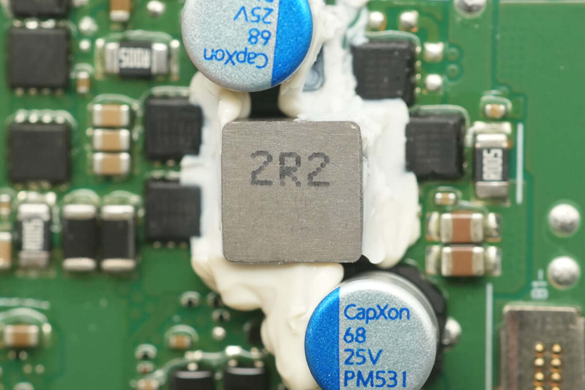 The other two Vergiga VS3610AE synchronous buck-boost MOSFETs are positioned on the other side of the inductor.