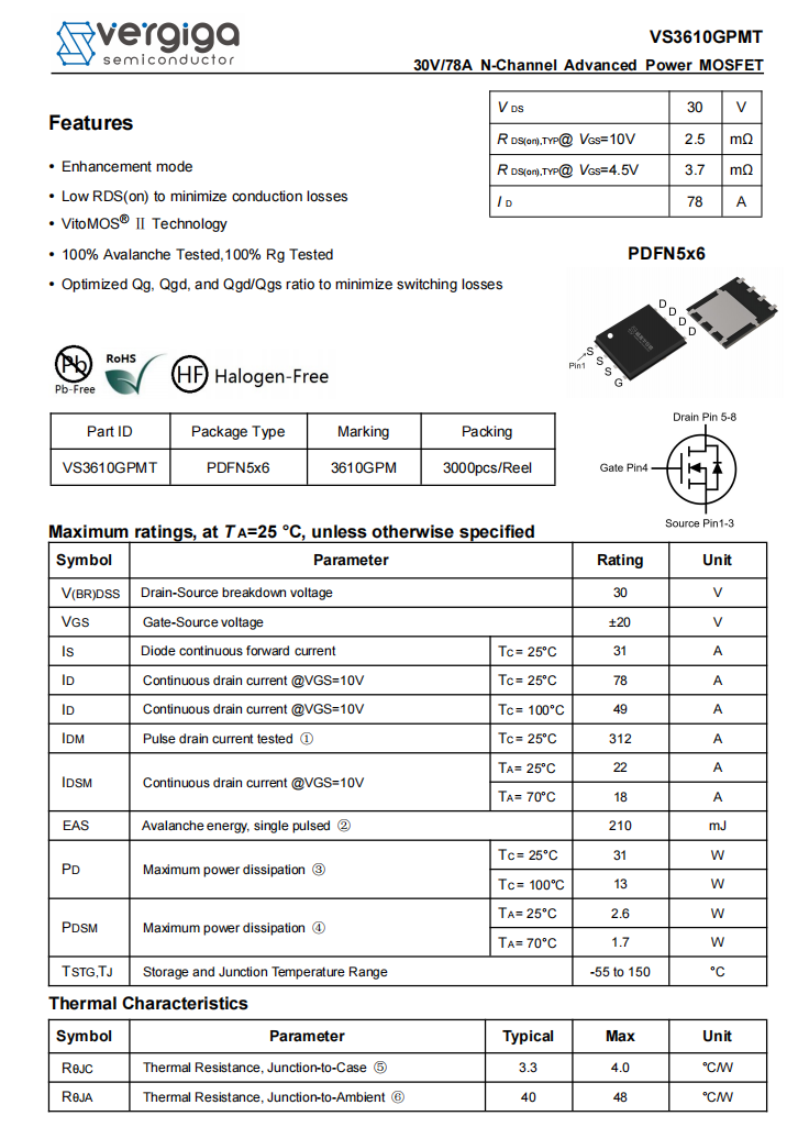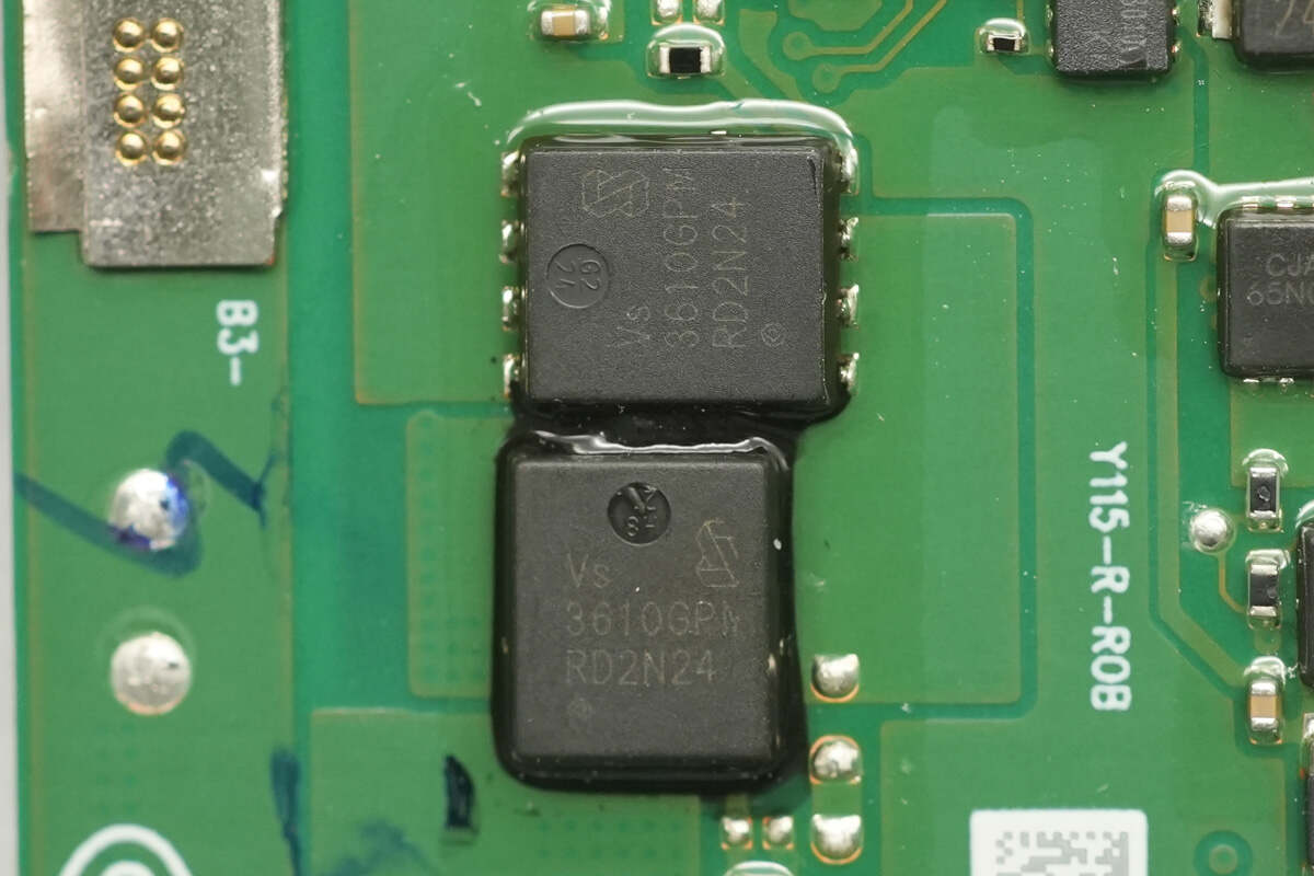 The synchronous buck-boost MOSFETs for the built-in USB-C cable’s buck-boost circuit are from Vergiga, model VS3610GPMT. They are N-channel MOSFETs with a voltage rating of 30 V and an on-resistance of 2.5 mΩ, packaged in a PDFN 5×6 package.