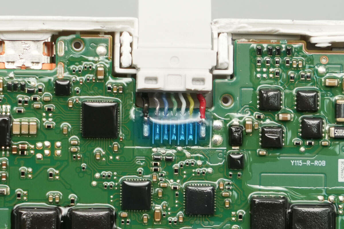 The connection between the built-in USB-C cable and the PCB is secured with adhesive for protection.