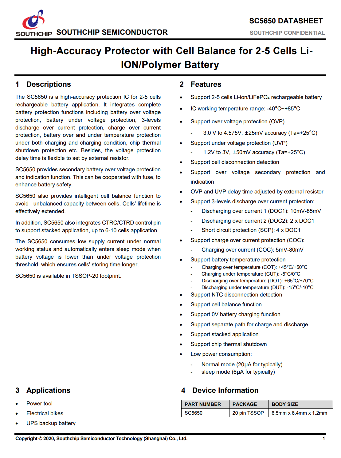 The SC5650 supports cascaded applications, allowing two chips to be used for 6–10 series battery packs. It features extremely low quiescent current and high protection accuracy, with multiple variants available to accommodate different voltages and battery types.