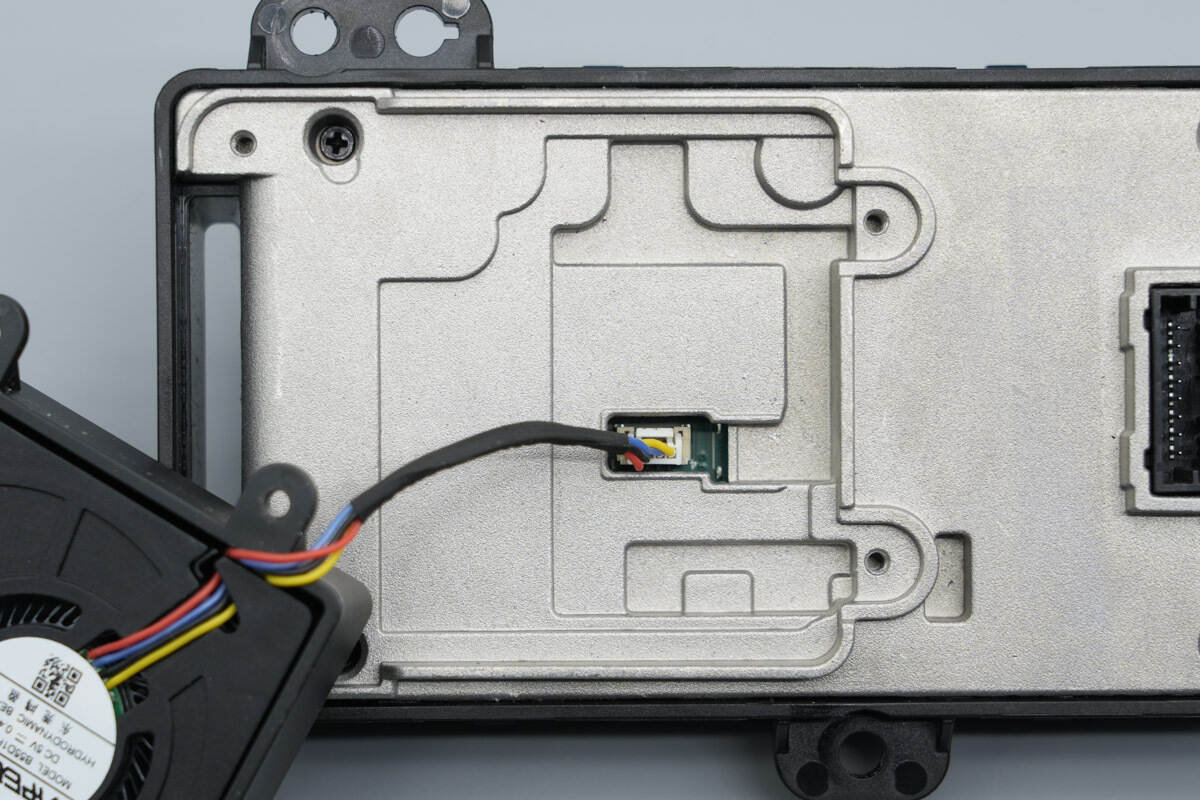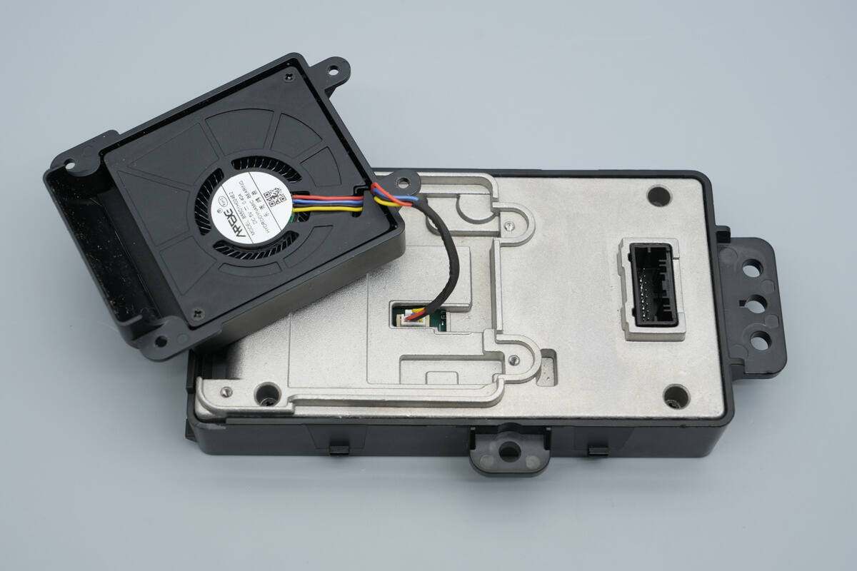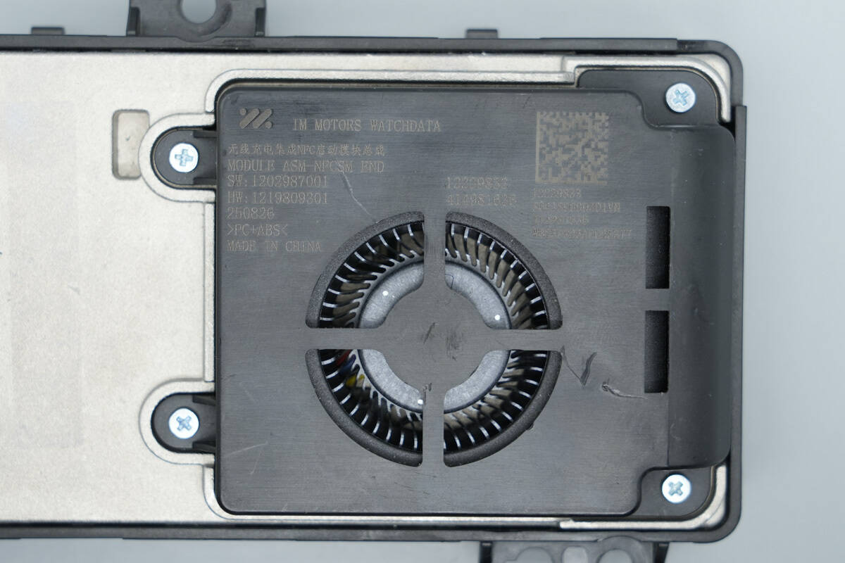 We recently acquired the IM Motors 50W in-car wireless charging module. The unit integrates NFC functionality and features a PCB shielding plate, designed to be installed beneath the interior trim panel. It provides a single charging position and uses an aluminum alloy housing on the rear side. A cooling fan is incorporated, directing airflow from the bottom to dissipate heat from both the smartphone and the wireless charging module. Next, let’s take a closer look at its internal components and design.