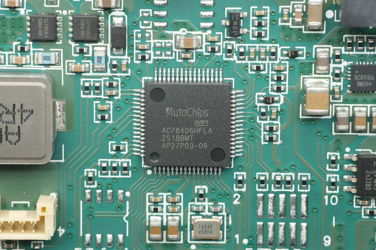 The MCU is from AutoChips, model AC78406HFLA. It is an automotive-grade MCU compliant with the AEC-Q100 Grade 1 standard, featuring an ARM Cortex-M4F core with a maximum frequency of 120 MHz and an integrated DSP. It includes 512 KB of flash memory, a CAN-FD module, as well as UART, SPI, and I²C interfaces. The MCU supports an operating temperature range of –40 °C to 125 °C and comes in an LQFP64 package.