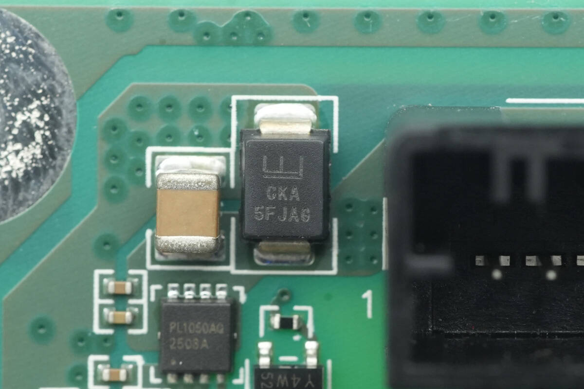 The input-side TVS is from Littelfuse, marked CKA, model TPSMB30CA-VR. It is a bidirectional TVS diode compliant with the AEC-Q101 standard, featuring a reverse standoff voltage of 30V and packaged in DO-214AA.