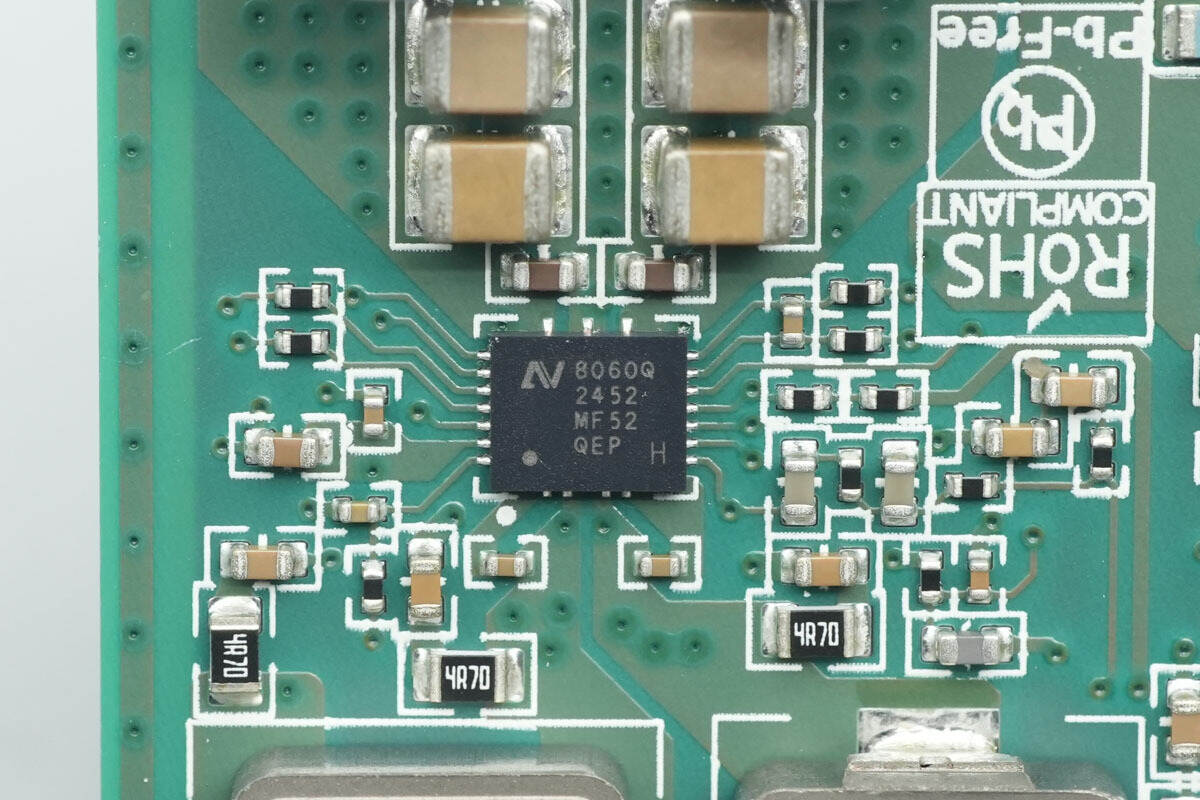 The wireless charging power stage chip is from NuVolta, model NU8060QH. It is a highly integrated, high-efficiency, and high-precision transmitter chip for wireless charging, compliant with the AEC-Q100 Grade 1 standard. The chip supports a wide input voltage range, with a recommended maximum operating voltage of 27 V and a transient voltage tolerance of up to 36 V. A single chip can drive wireless charging loads of up to 80 W, enabling high-power wireless fast charging.