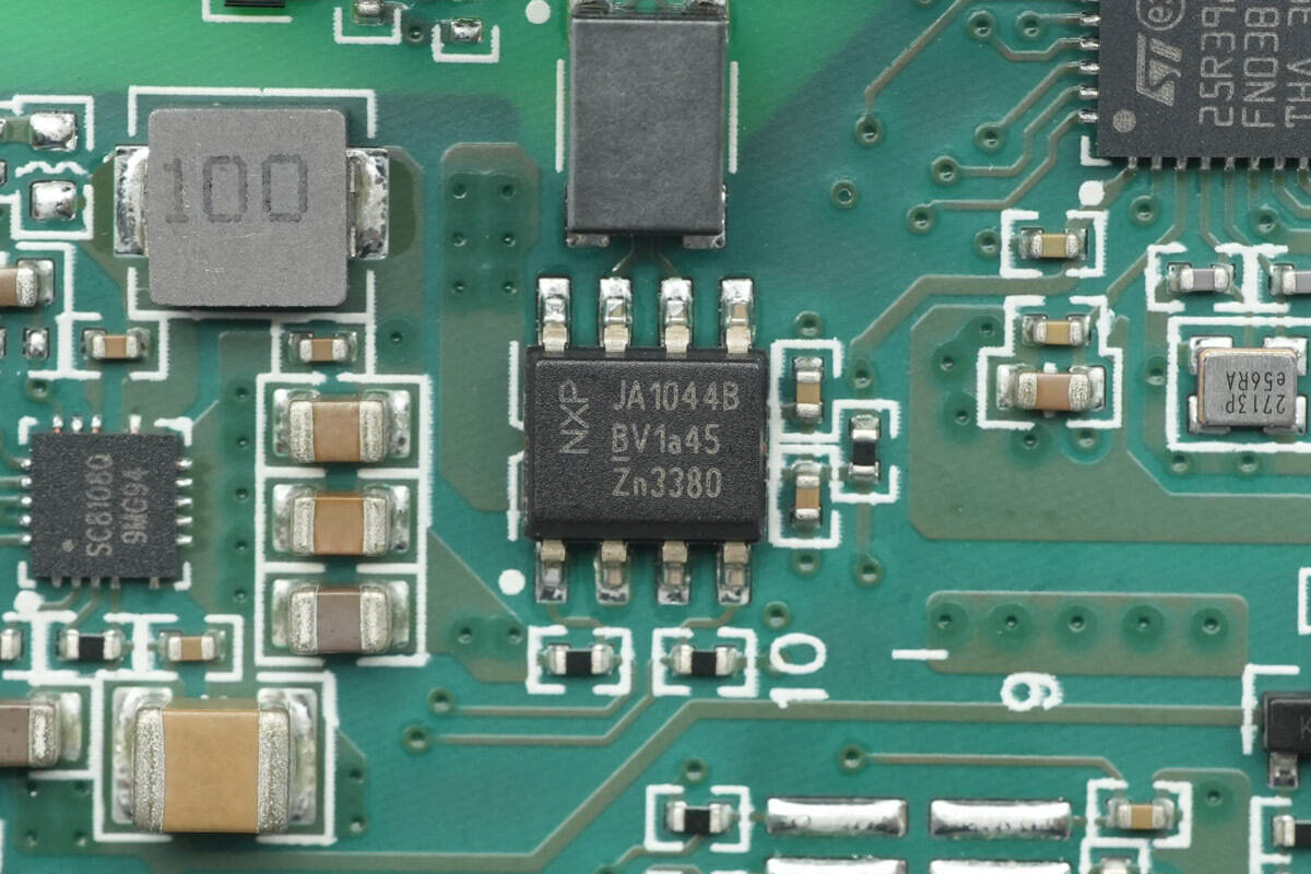 The CAN transceiver is from NXP, model TJA1044BT. It is a high-speed CAN bus transceiver supporting low-power mode and bus wake-up, and comes in an SO8 package.