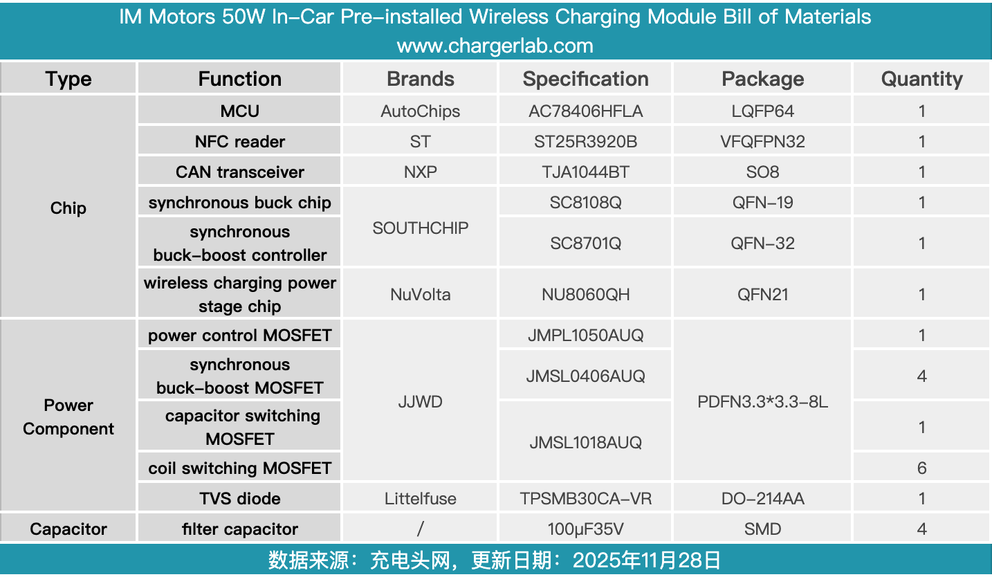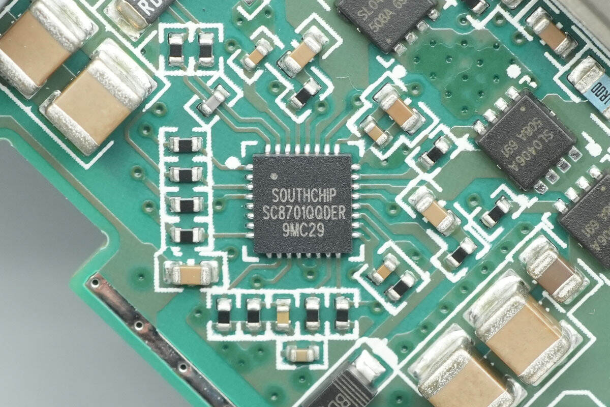 After taking it apart, we found that it uses the AutoChips AC78406HFLA as the wireless charging master controller, paired with the NuVolta NU8060QH for wireless power transmission. The SouthChip SC8701Q synchronous buck-boost controller handles the buck-boost voltage conversion to supply the wireless charging power stage chip, while the SC8108Q synchronous buck converter provides power to the wireless charging master controller.
