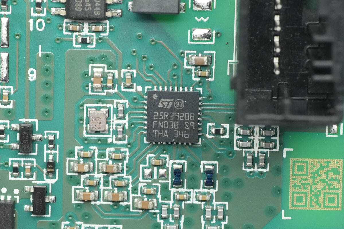 The NFC reader is from STMicro, model ST25R3920B. It is an automotive-grade device used for CCC digital keys and vehicle center consoles, compliant with the AEC-Q100 Grade 2 standard. It supports an operating voltage range of 2.6–5.5 V and a peripheral communication voltage range of 1.65–5.5 V, and comes in a VFQFPN32 package.