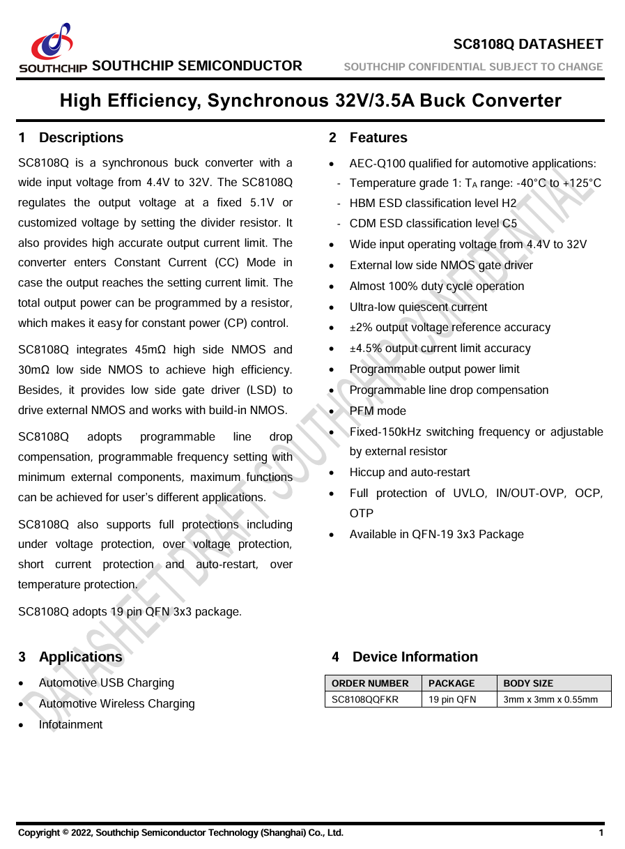 The synchronous buck chip is from SouthChip, model SC8108Q. It is automotive-grade, compliant with the AEC-Q100 Grade 1 standard, supporting an input voltage range of 4.4–32 V and an output current of 3.5 A. It integrates a 45 mΩ PMOS and a 30 mΩ NMOS, with support for driving an external NMOS. The chip features programmable line-loss compensation, a programmable switching frequency, and protections for undervoltage, overvoltage, short circuit, and overtemperature. It comes in a QFN-19 package.