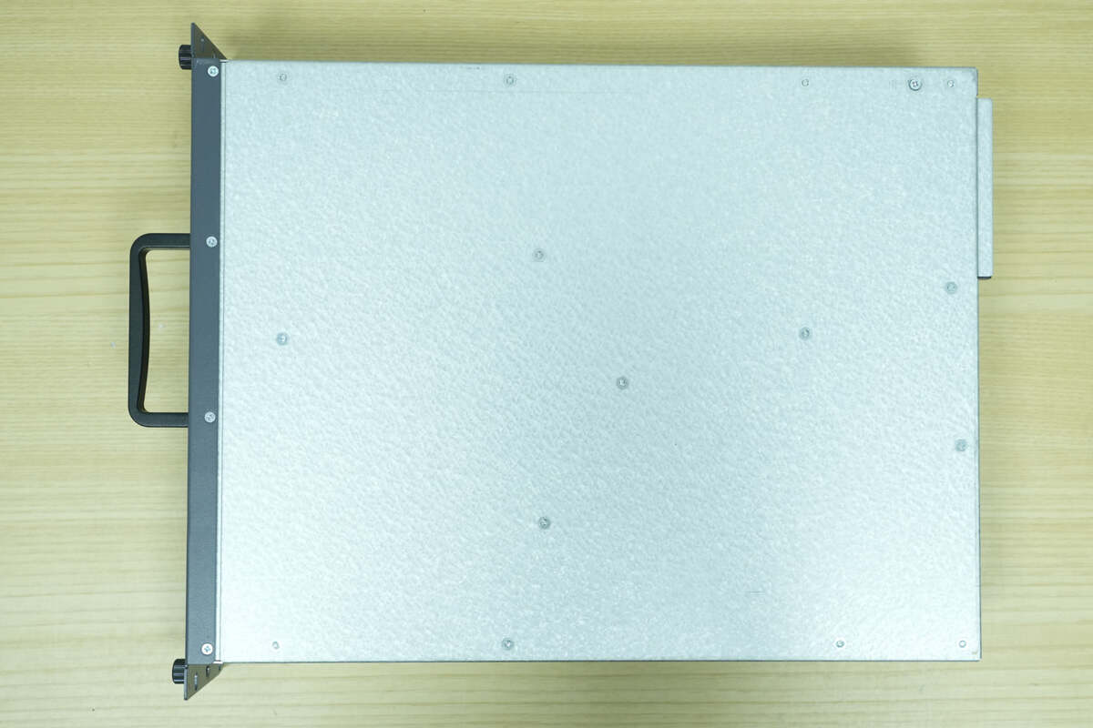 There are screws on both sides of the front panel. The left side features LED indicators and a DIP switch, while the center area includes a handle and cooling fans.