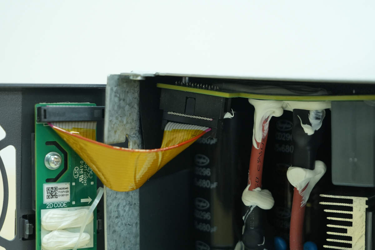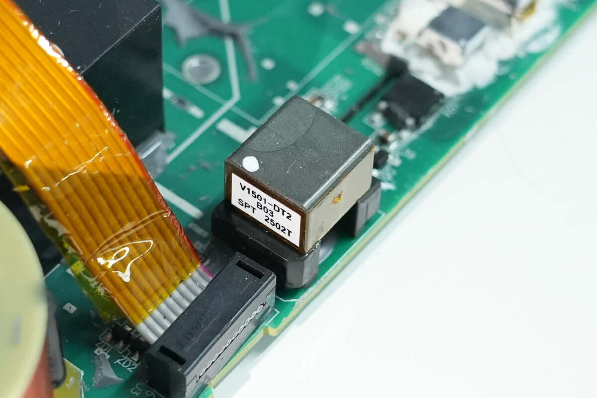 The PCB for the LED indicators and the DIP switch is connected via a ribbon cable.