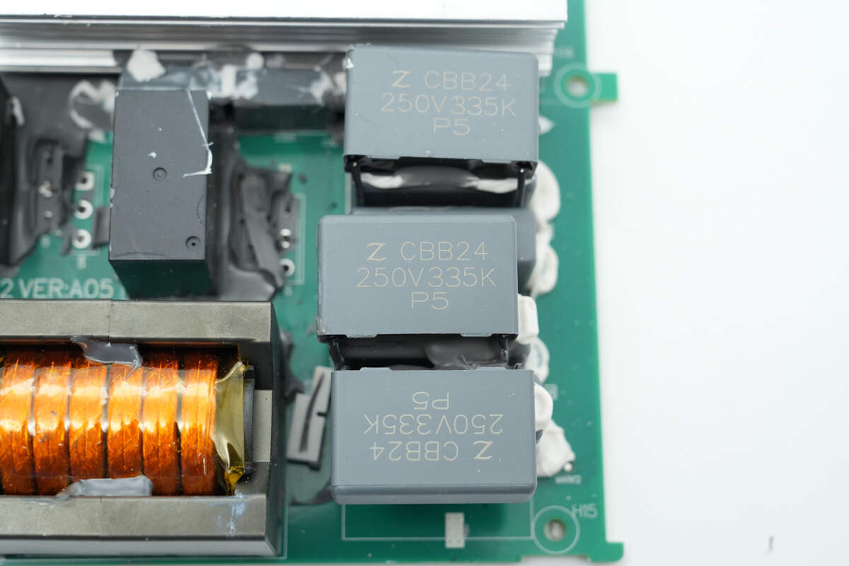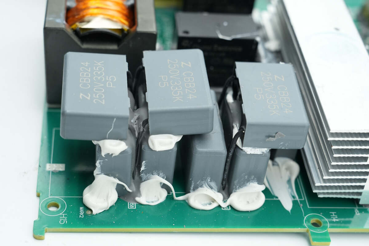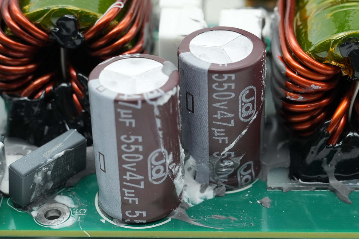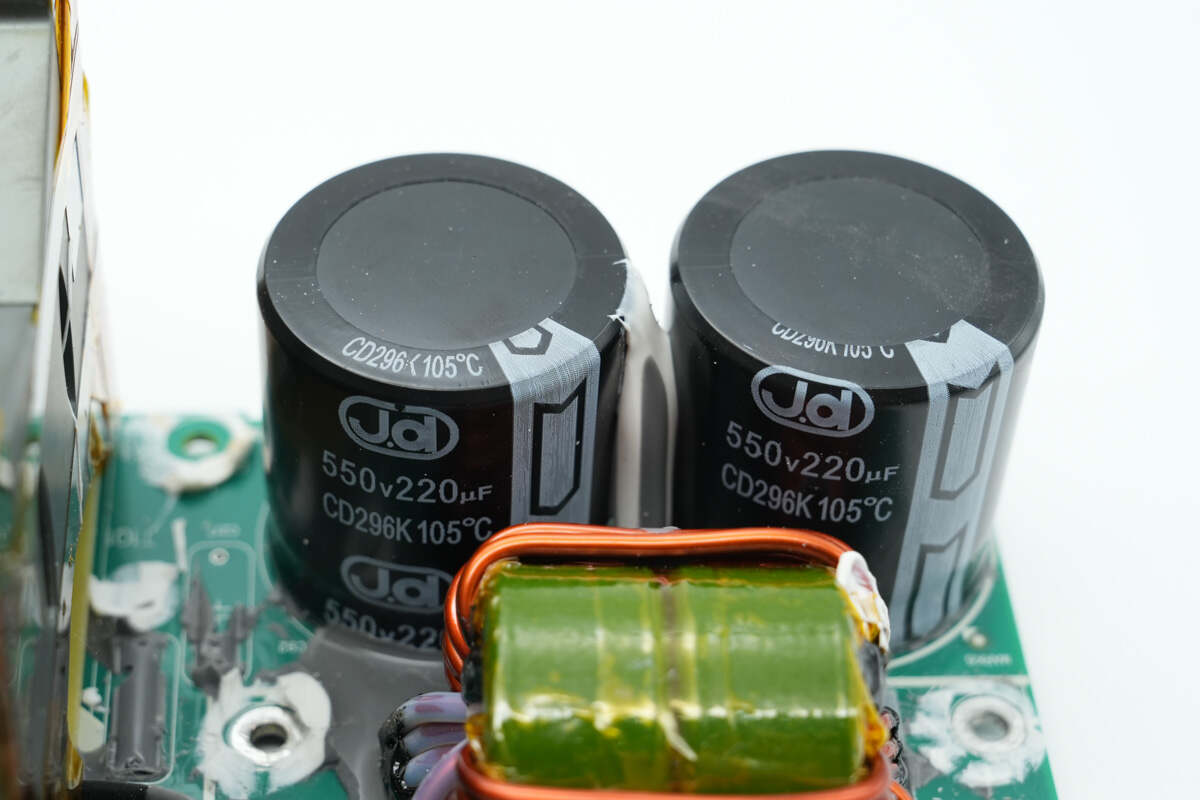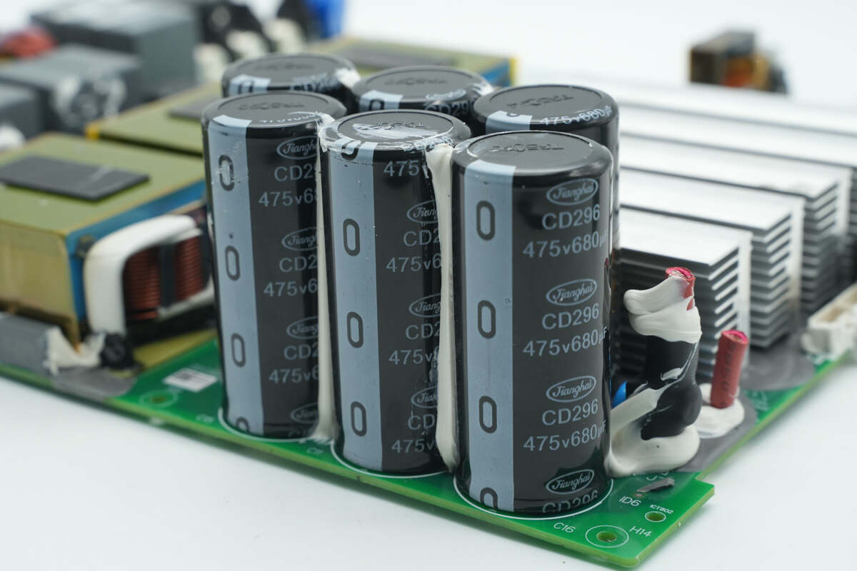 The output filter capacitors are from Jianghai, part of the CD296 series of long-life electrolytic capacitors, rated at 475 V, 680 μF. Adhesive is applied between the capacitors for reinforcement.