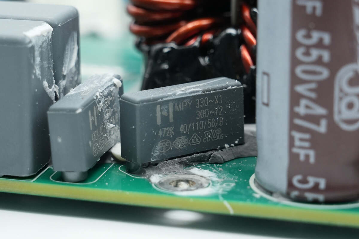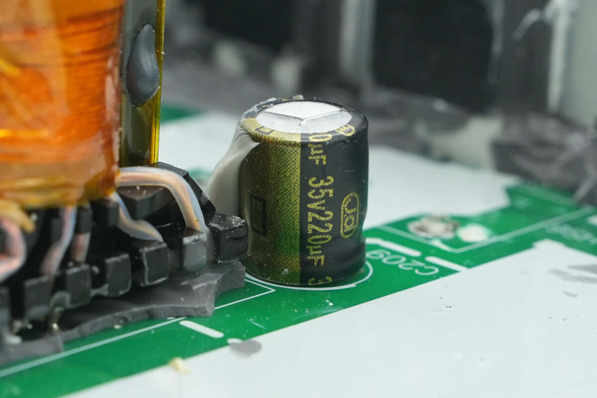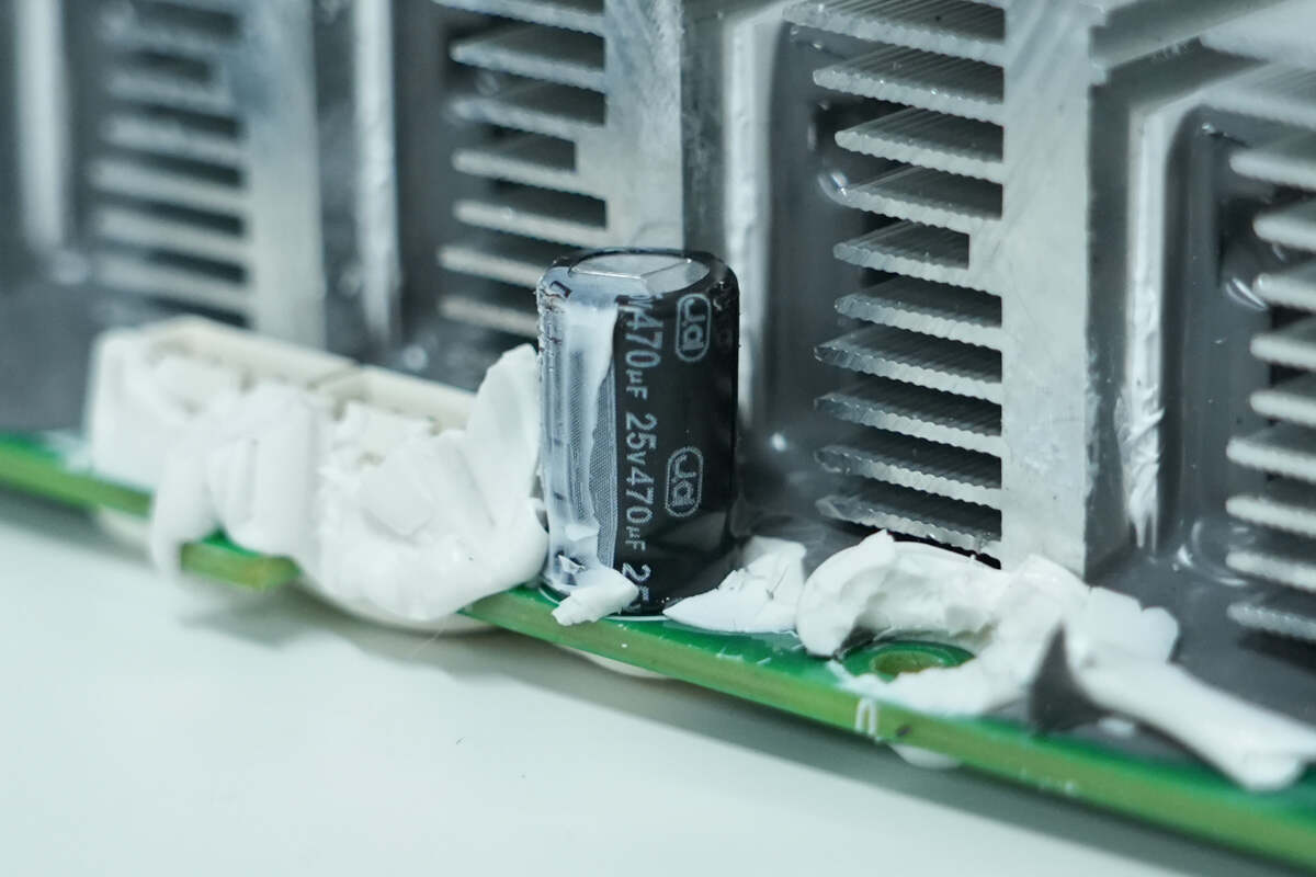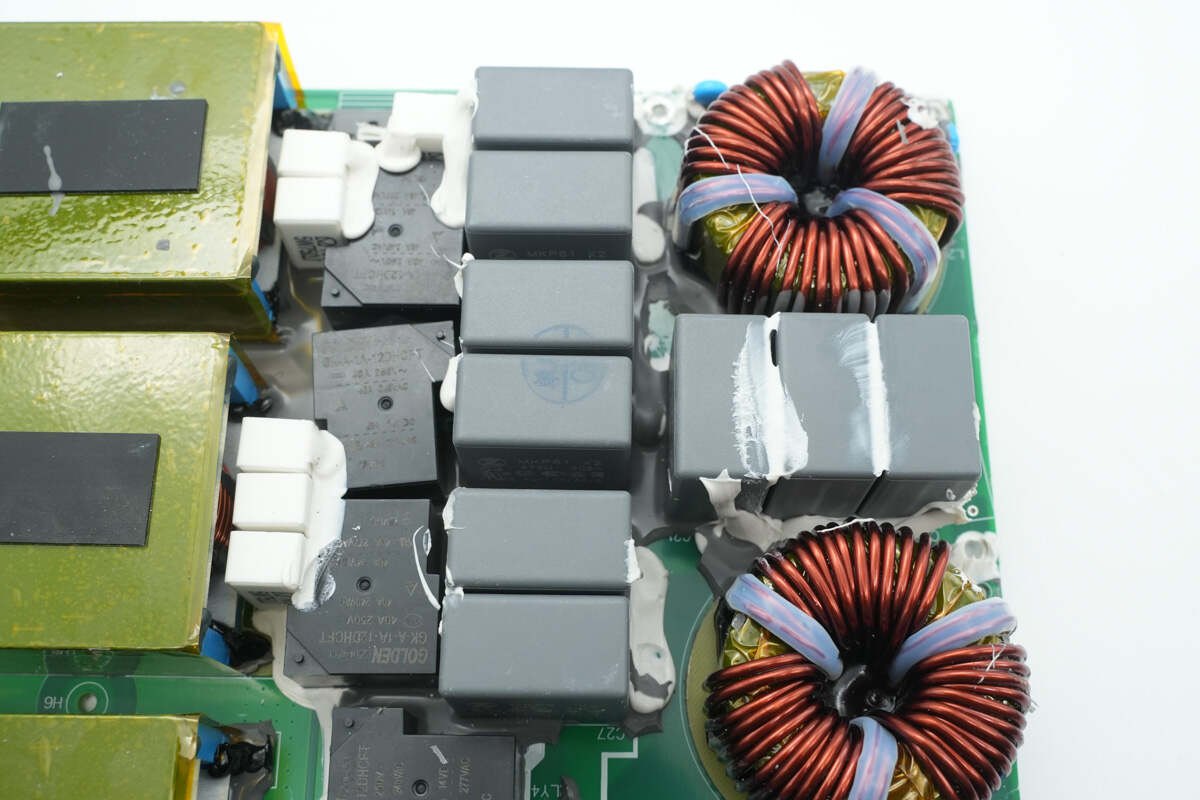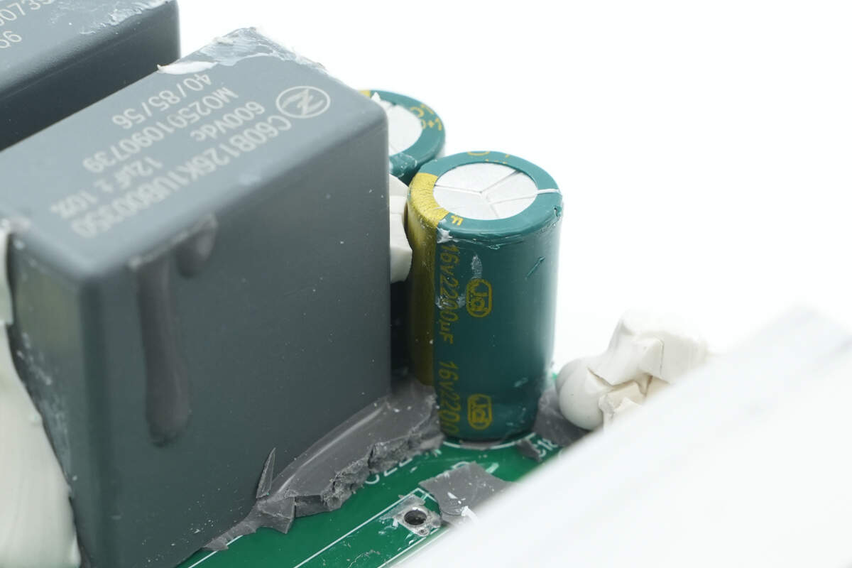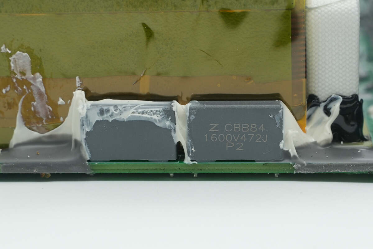 The output filter capacitors are from Jianghai, part of the CD296 series of long-life electrolytic capacitors, rated at 475 V, 680 μF. Adhesive is applied between the capacitors for reinforcement.