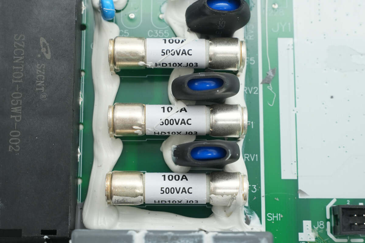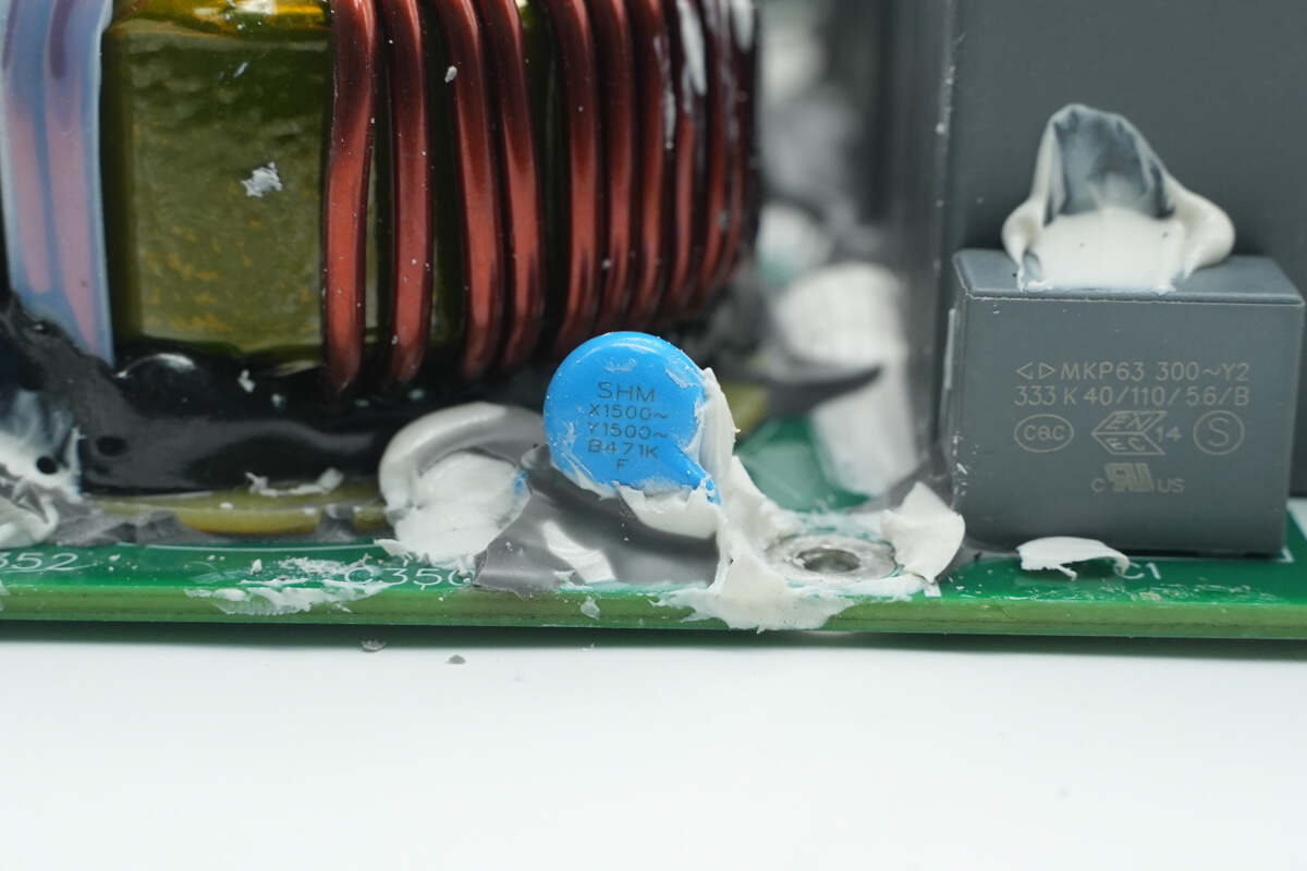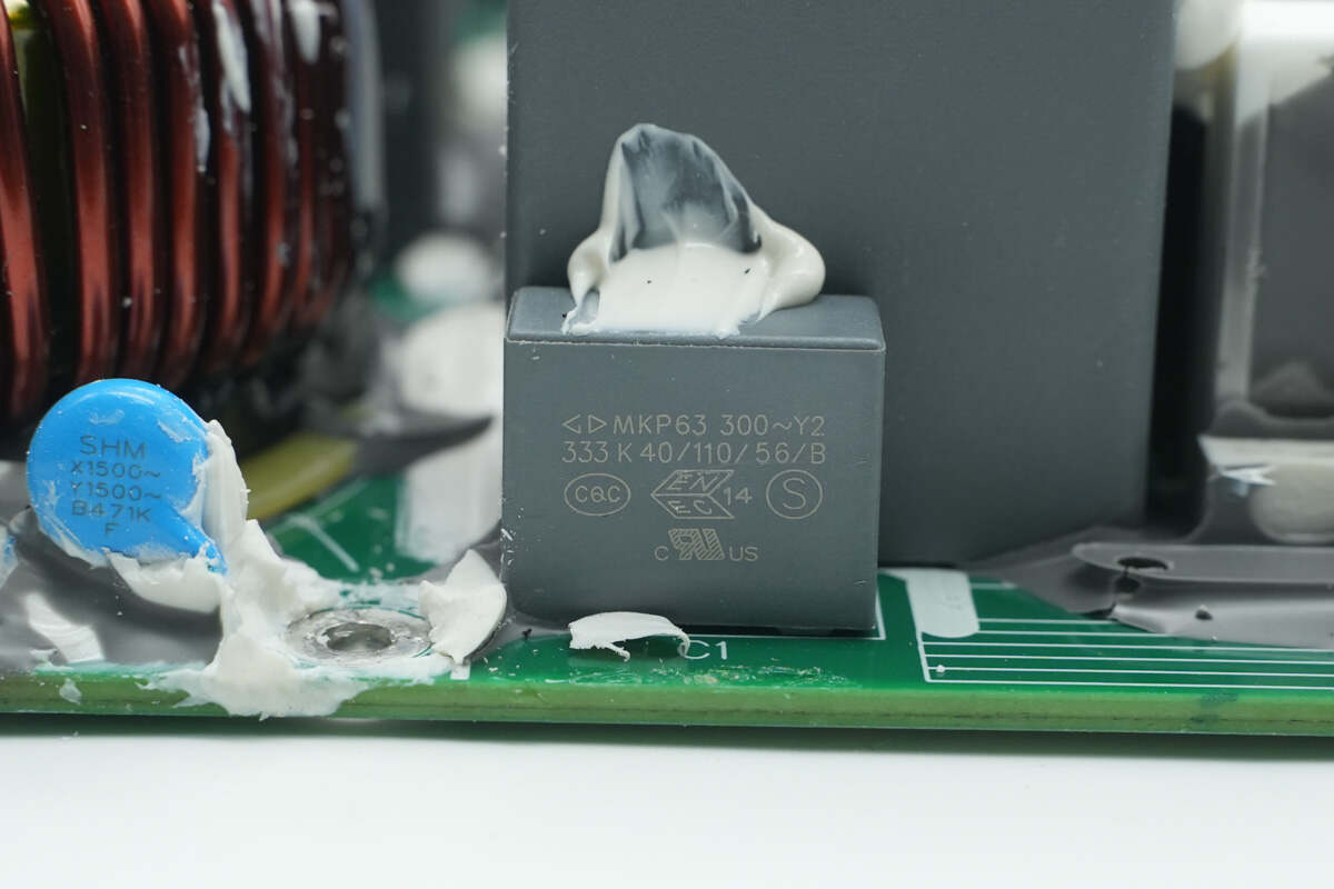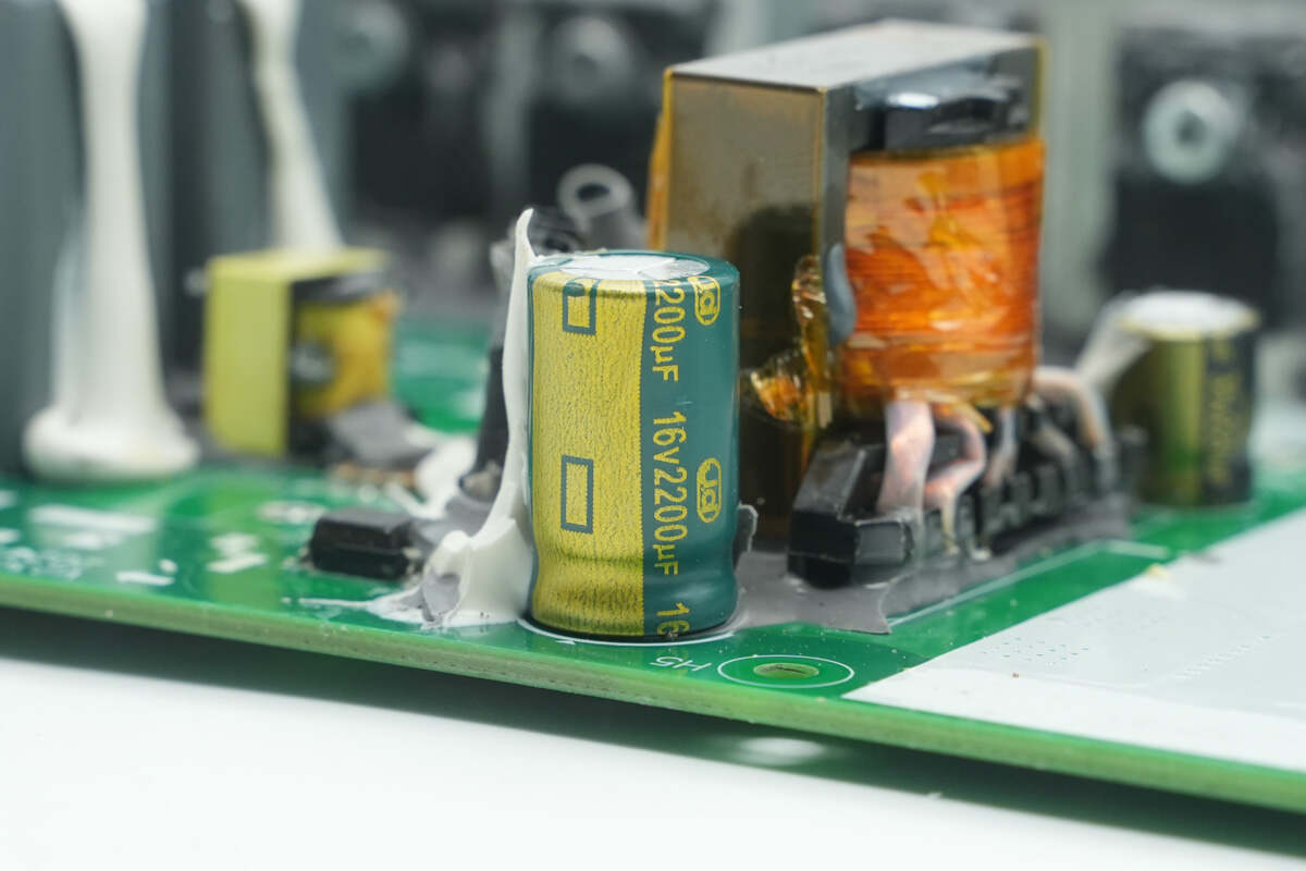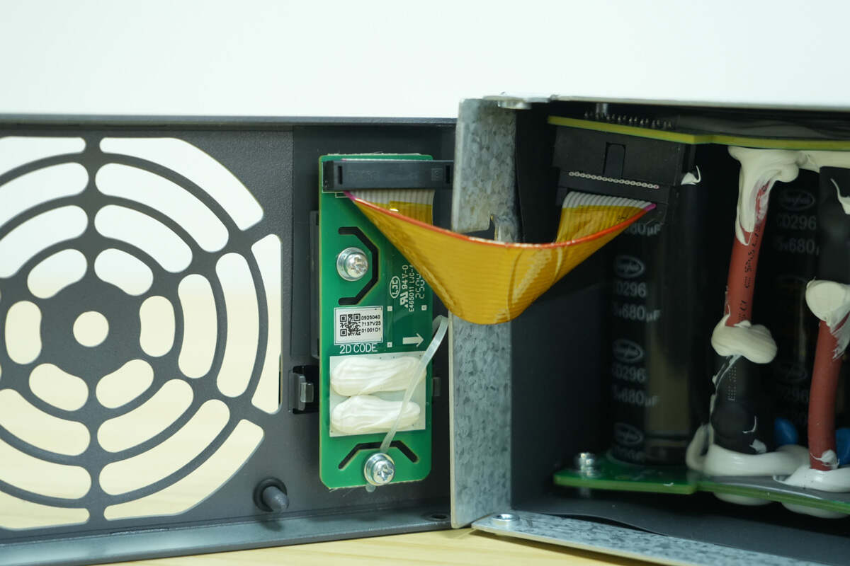 The output filter capacitors are from Jianghai, part of the CD296 series of long-life electrolytic capacitors, rated at 475 V, 680 μF. Adhesive is applied between the capacitors for reinforcement.