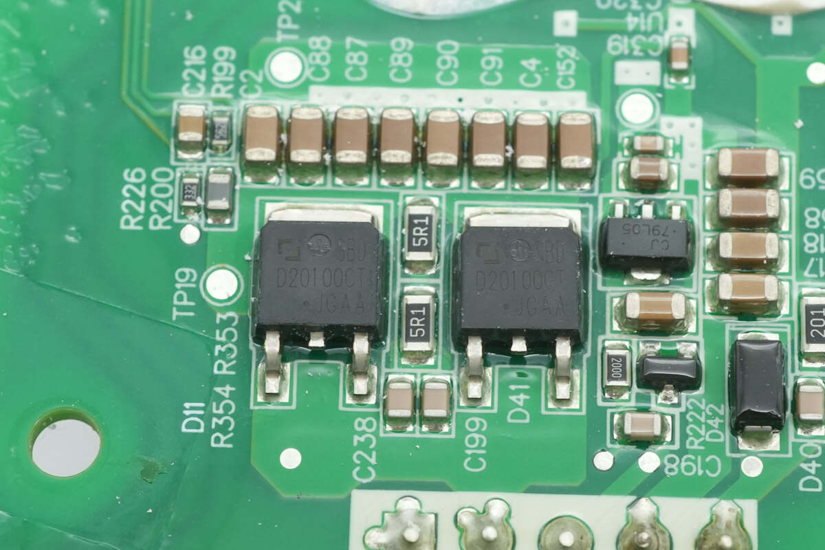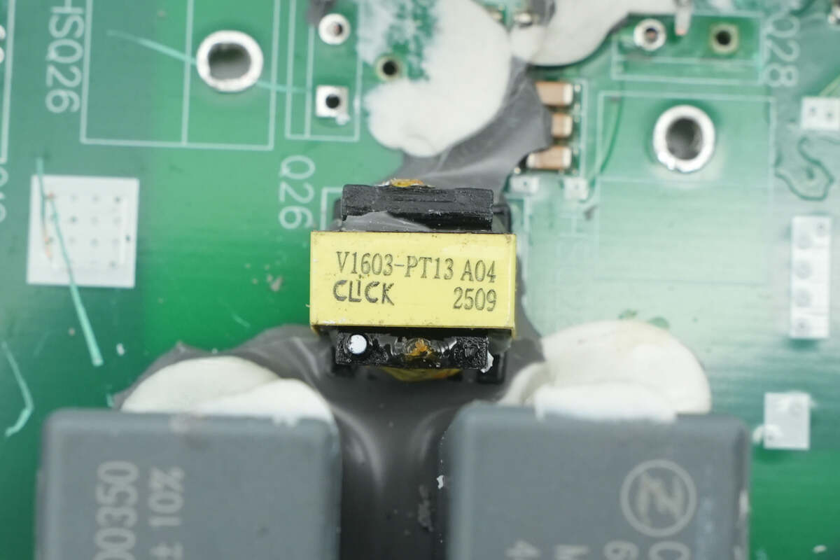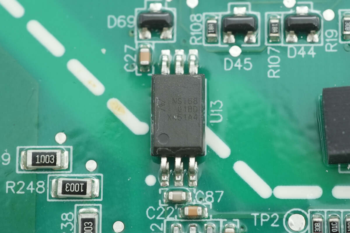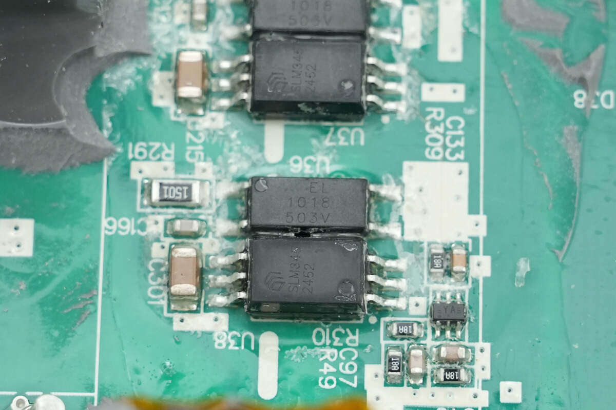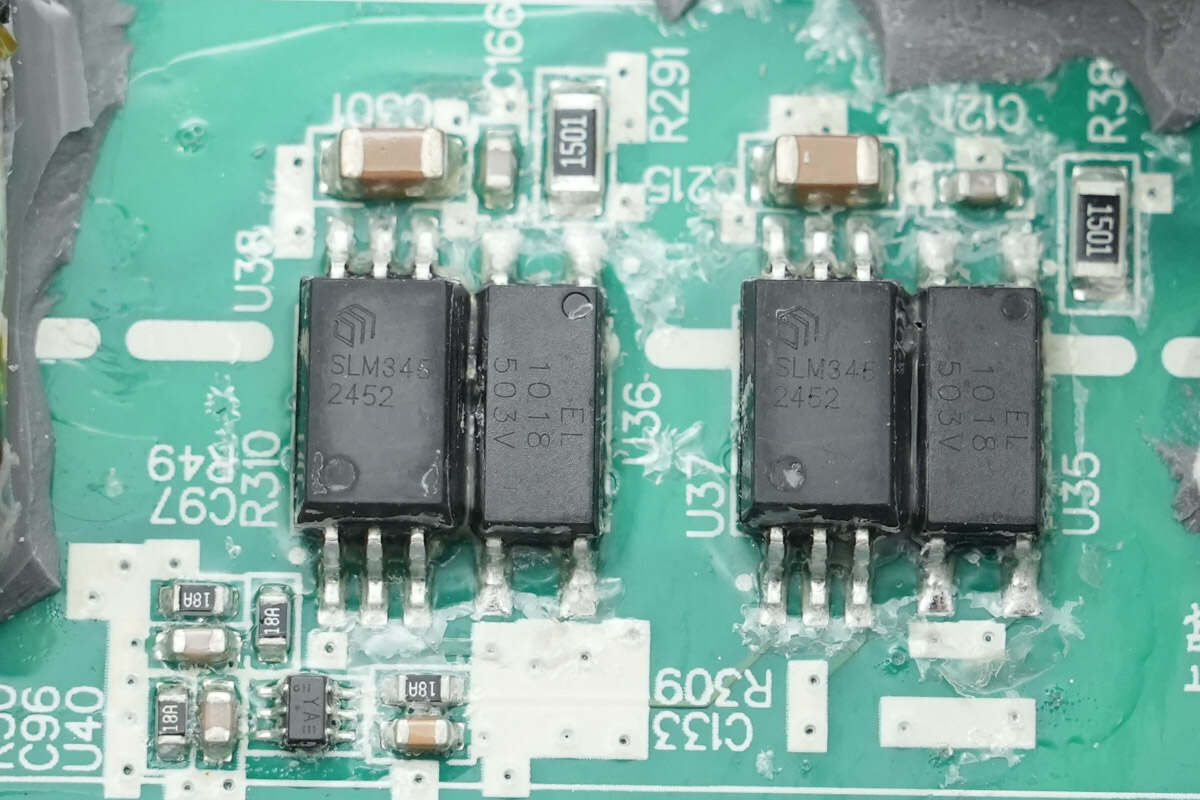 After taking it apart, we found that the PCBA module is composed of two stacked layers, consisting of a PFC module and an LLC module, connected via wiring. Both the PFC controller and the LLC controller use the TI TMS320F28035PAG, with input current detection performed through AMC1200B isolation chips. The PFC MOSFETs are Sanrise SRC60R022FBS, paired with Sanan SDS120J40H3 SiC diodes for rectification, and isolated via NOVOSENSE NSi6801BD drivers.